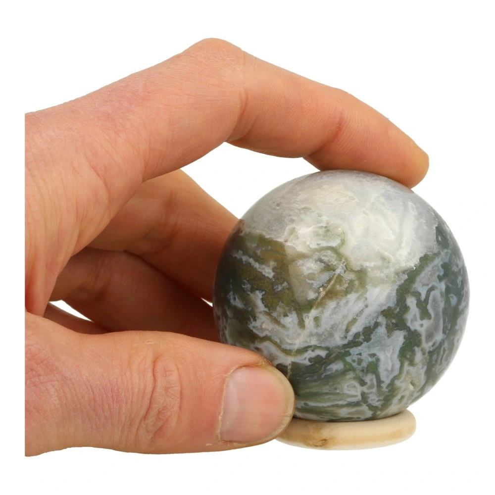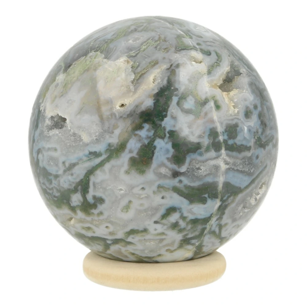 Fraaie mosagaat bol met veel zachte kleuren en een aantal holtes en een diameter van circa 58mm op een houten ringetje. Je ontvangt de mosagaat bol van de foto. Een fraaie bol met rustige energie en fraaie tekening.
