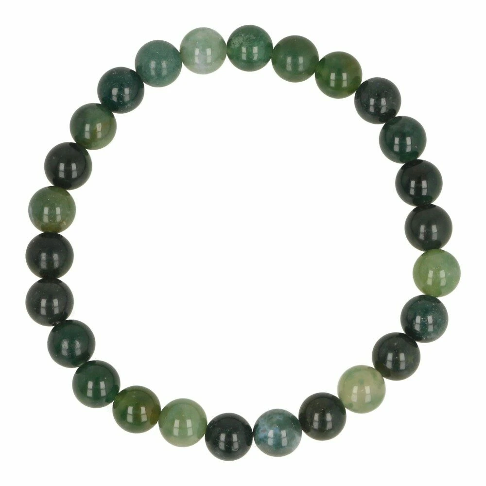Mosagaat herenarmband met kralen van 8mm. Deze mosagaat herenarmband is geregen op rekbaar koord en past bij een polsomtrek van ongeveer 19cm. Iedere mosagaat herenarmband is anders, je ontvangt een soortgelijke als op de foto.