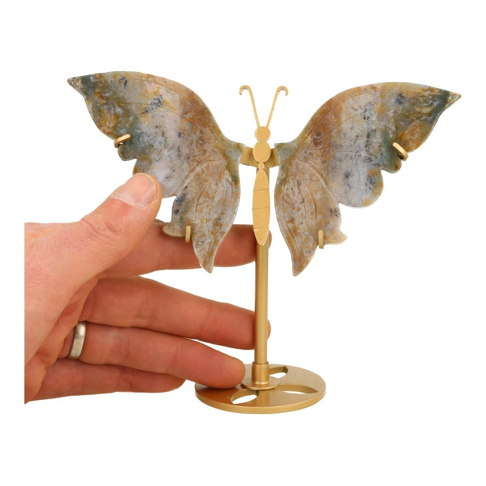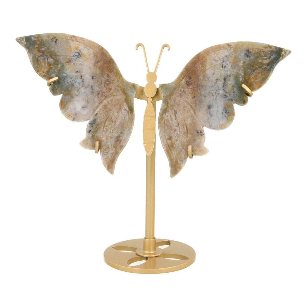 Fraaie mosagaat vlinder op goudkleurige standaard ‘nr1’. De afmetingen van deze mosagaat vlinder op standaard zijn ongeveer 17 cm breed en 14 cm hoog. Uniek exemplaar met fraaie mosagaat vleugels, je ontvangt uiteraard de mosagaat vlinder van de foto.