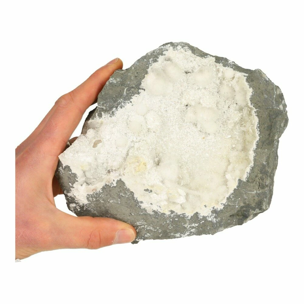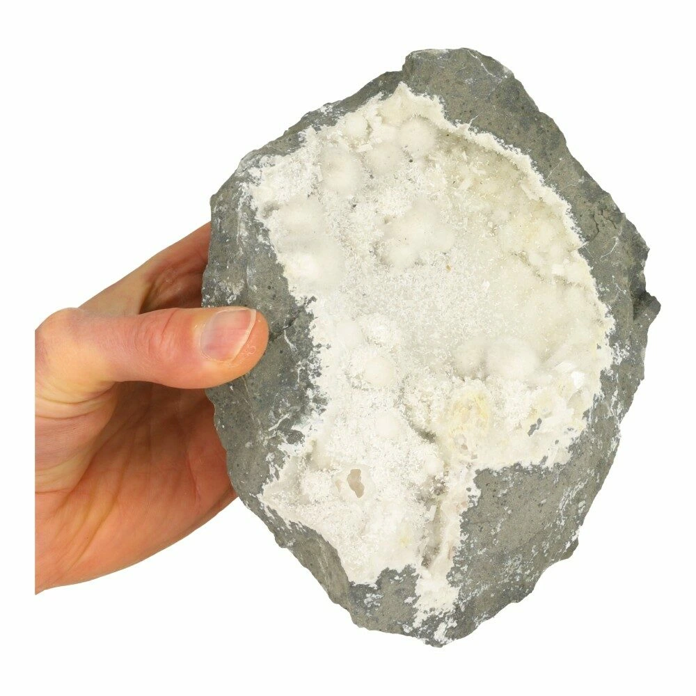 Fraaie grote okeniet geode uit India met helderwitte okeniet kristallen die in fraaie bolvorm zijn gevormd. Er zitten zowel mooie bolvormige als stekelige kristallen in deze okeniet geode, samen met scoleciet en kleine kwartskristallen. De afmeting van deze okeniet geode is ongeveer 19,5cm breed, 16cm diep en 9cm hoog. Je ontvangt de okeniet geode van de foto.