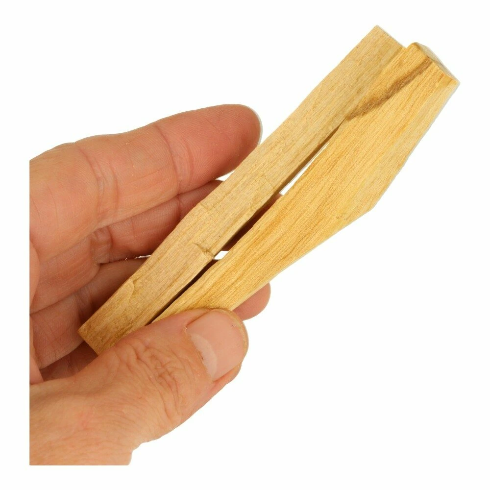 Fijne stokjes palo santo, klaar voor gebruik. Om de rook van de palo santo te gebruiken mag het stokje even branden totdat het gaat gloeien. De stokjes zijn ongeveer 10cm lang en hebben een doorsnede van ongeveer 1cm.