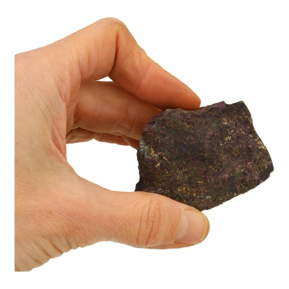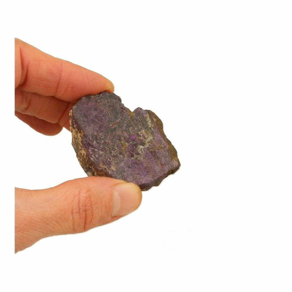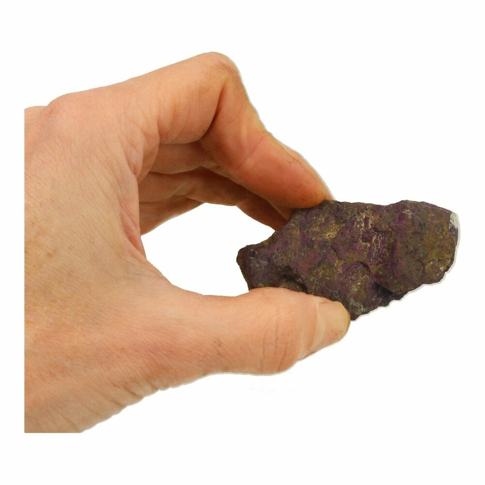 Fraaie stukken ruwe purpuriet uit Namibië. Ieder stukje is uniek van vorm en kleur. Onder de juiste hoek hebben ze allemaal een fijne intens paarse glans. Het ene stukje meer dan het andere, maar allemaal bevatten ze de fraaie pupuriet kleur. De afmetingen variëren en zijn ongeveer 5-7cm lang en breed. Je ontvangt een soortgelijk stuk purpuriet als op de foto.
