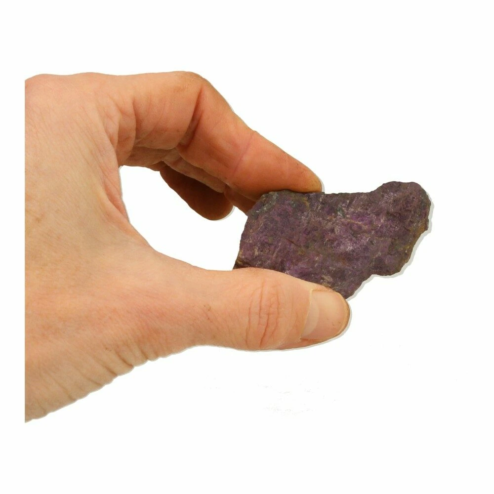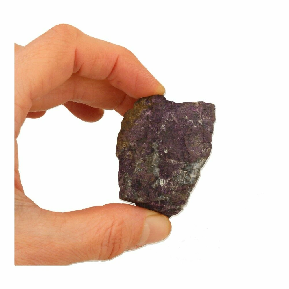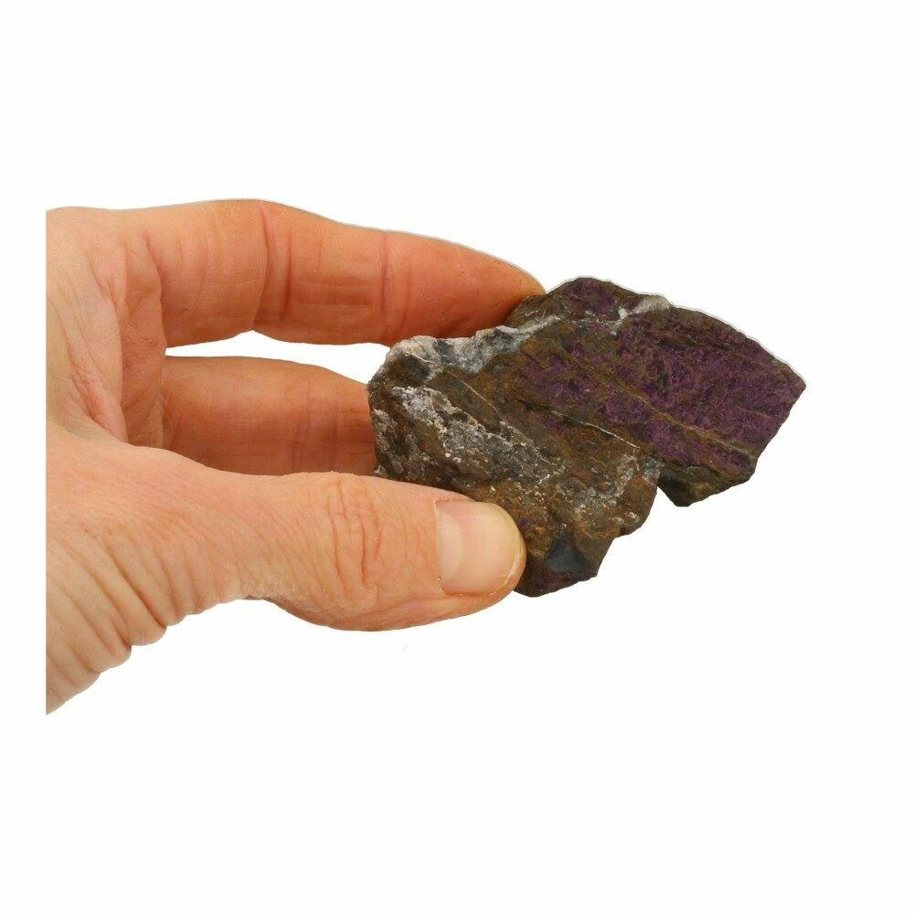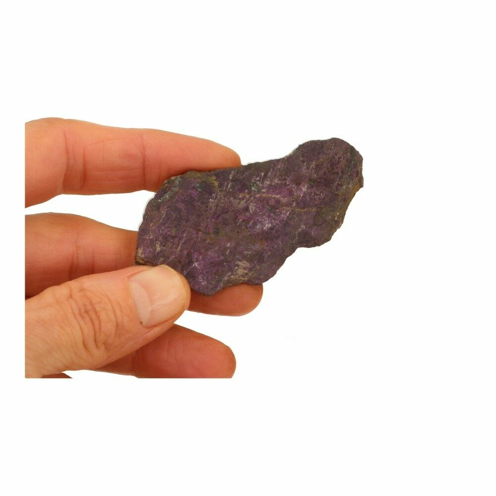 Fraaie stukken ruwe purpuriet uit Namibië. Ieder stukje is uniek van vorm en kleur. Onder de juiste hoek hebben ze allemaal een fijne intens paarse glans. Het ene stukje meer dan het andere, maar allemaal bevatten ze de fraaie pupuriet kleur. De afmetingen variëren en zijn ongeveer 5-7cm lang en breed. Je ontvangt een soortgelijk stuk purpuriet als op de foto.