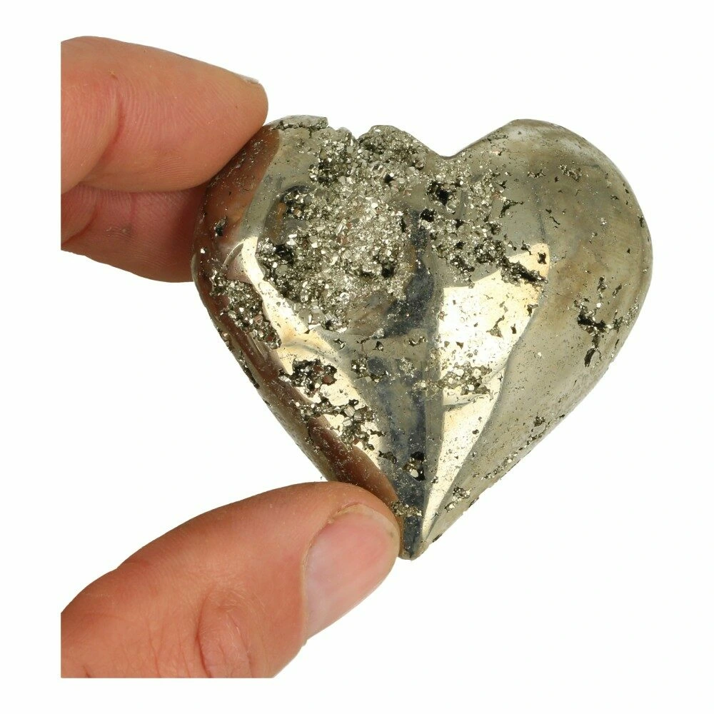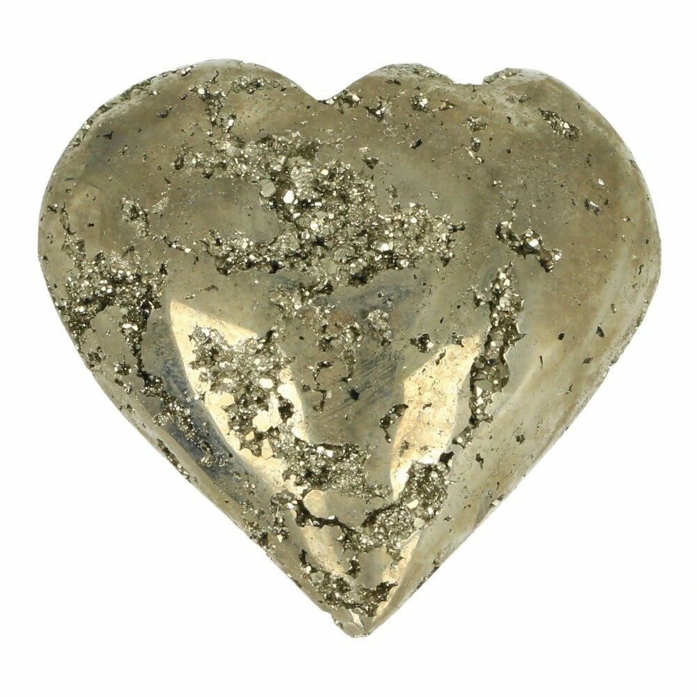 Mooi formaat pyriet hart uit Peru. De afmeting van dit pyriet hart is 61mm breed, 57mm hoog en 23mm dik. Dit pyriet hart heeft een fraaie glans en holtes met pyriet kristallen. Je ontvangt het hart van de foto.