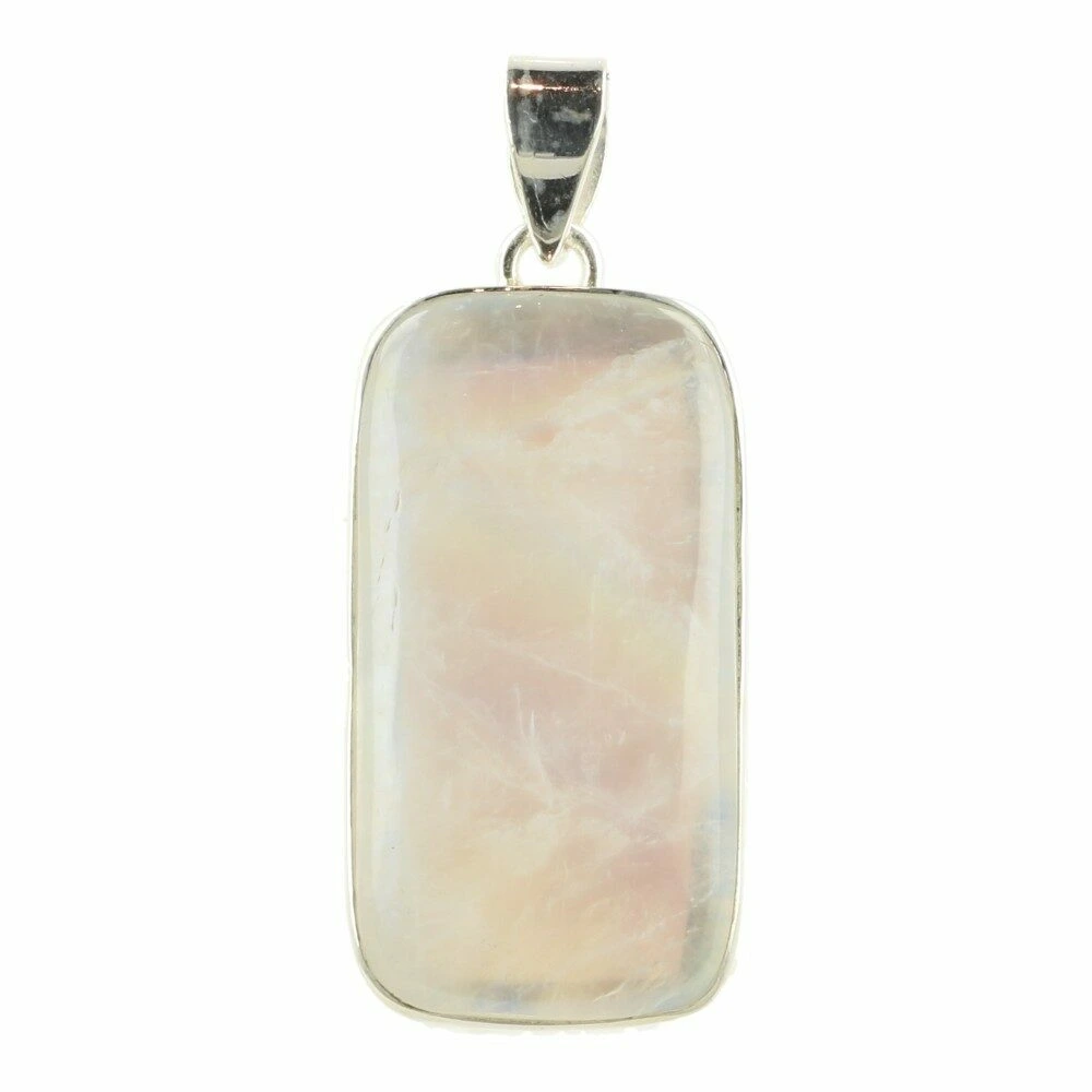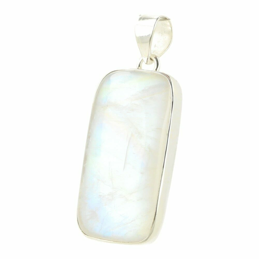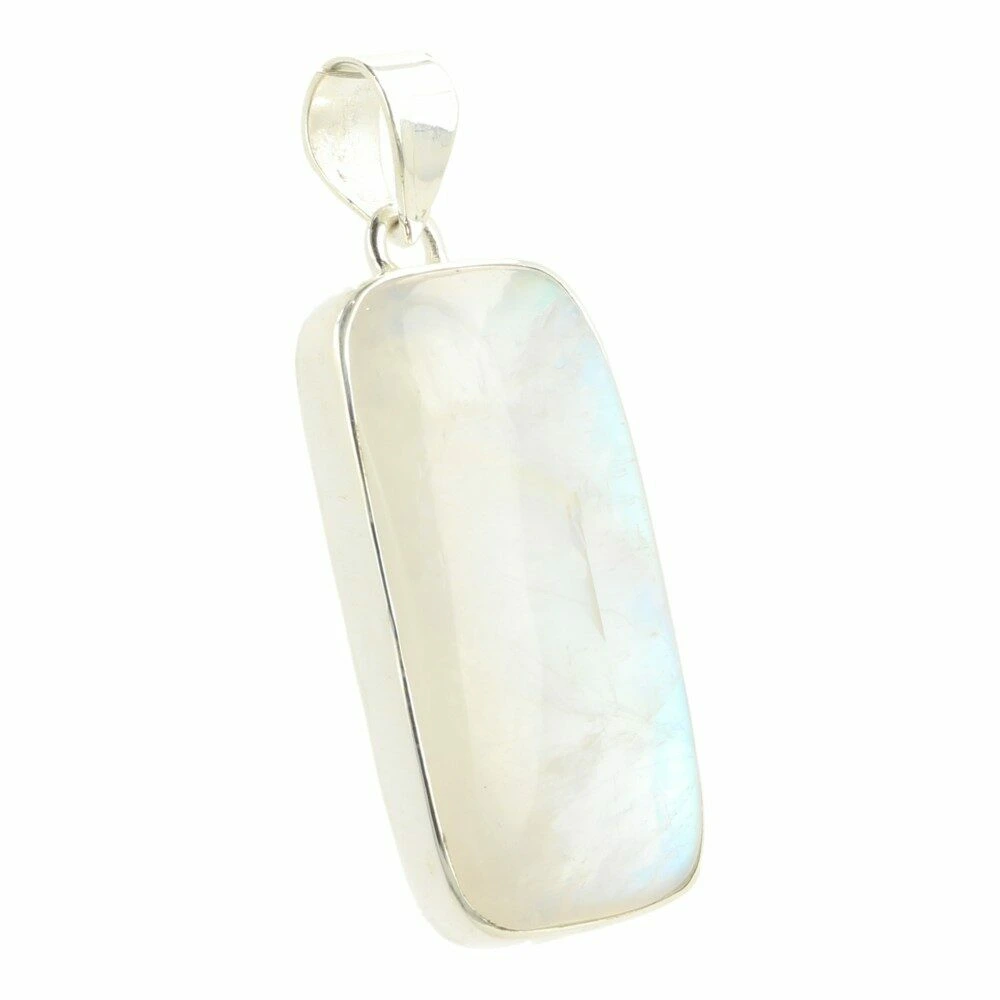 Mooie semi-transparante regenboog maansteen hanger in zilver ‘nr9’. Onder de juiste hoek heeft deze regenboog maansteen hanger de kenmerkende regenboogkleurige gloed van regenboogmaansteen. Deze fraaie hanger is een klein beetje doorschijnend en heeft een subtiele witte kleur. De blauwe flash is helder en uitbundig, net zoals de energie van deze hanger. Helder en fris.