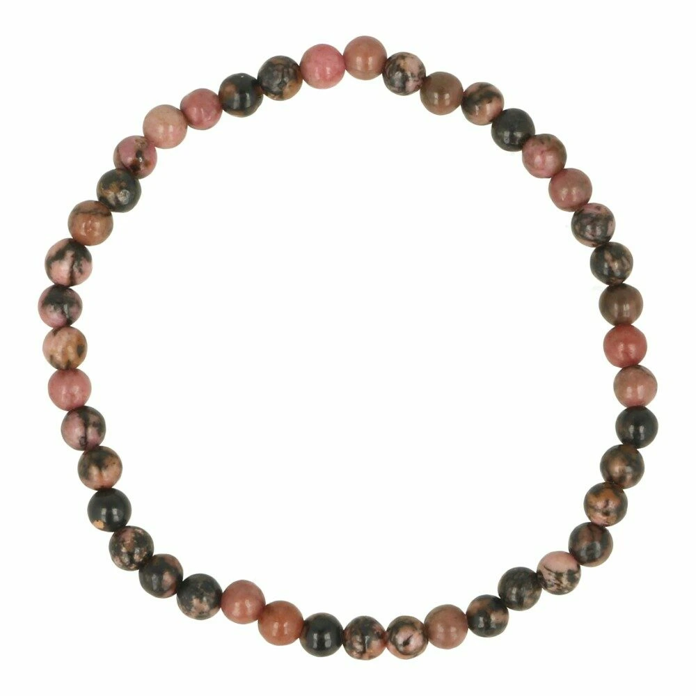 Fijne rhodoniet armband met kralen van 4mm aan rekbaar koord. Rhodoniet is een veelal roze steen met zwarte insluitsels van mangaan oxide. De lengte van de rhodoniet armband past bij een polstomtrek van circa 16-17cm. Je ontvangt een soortgelijke rhodoniet armband als op de foto.