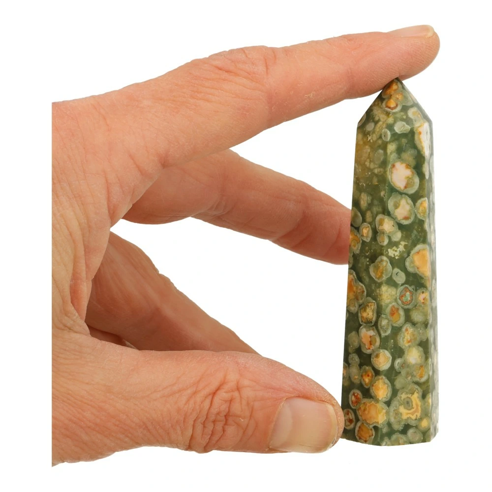 Prachtige rhyoliet toren met fraaie tekening. Rhyoliet wordt ook wel regenwoudjaspis genoemd. Je ontvangt de rhyoliet toren van de foto. De afmeting is ongeveer 81mm hoog met een basis van 20 x 20mm.