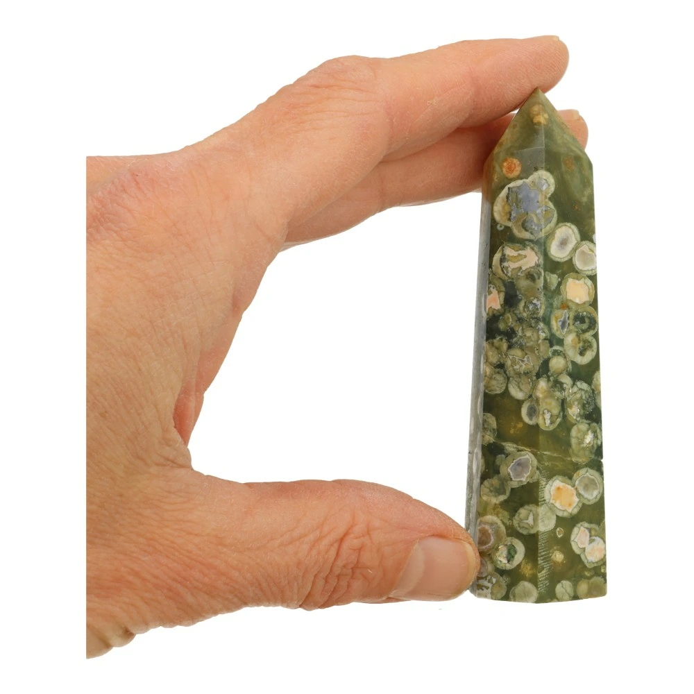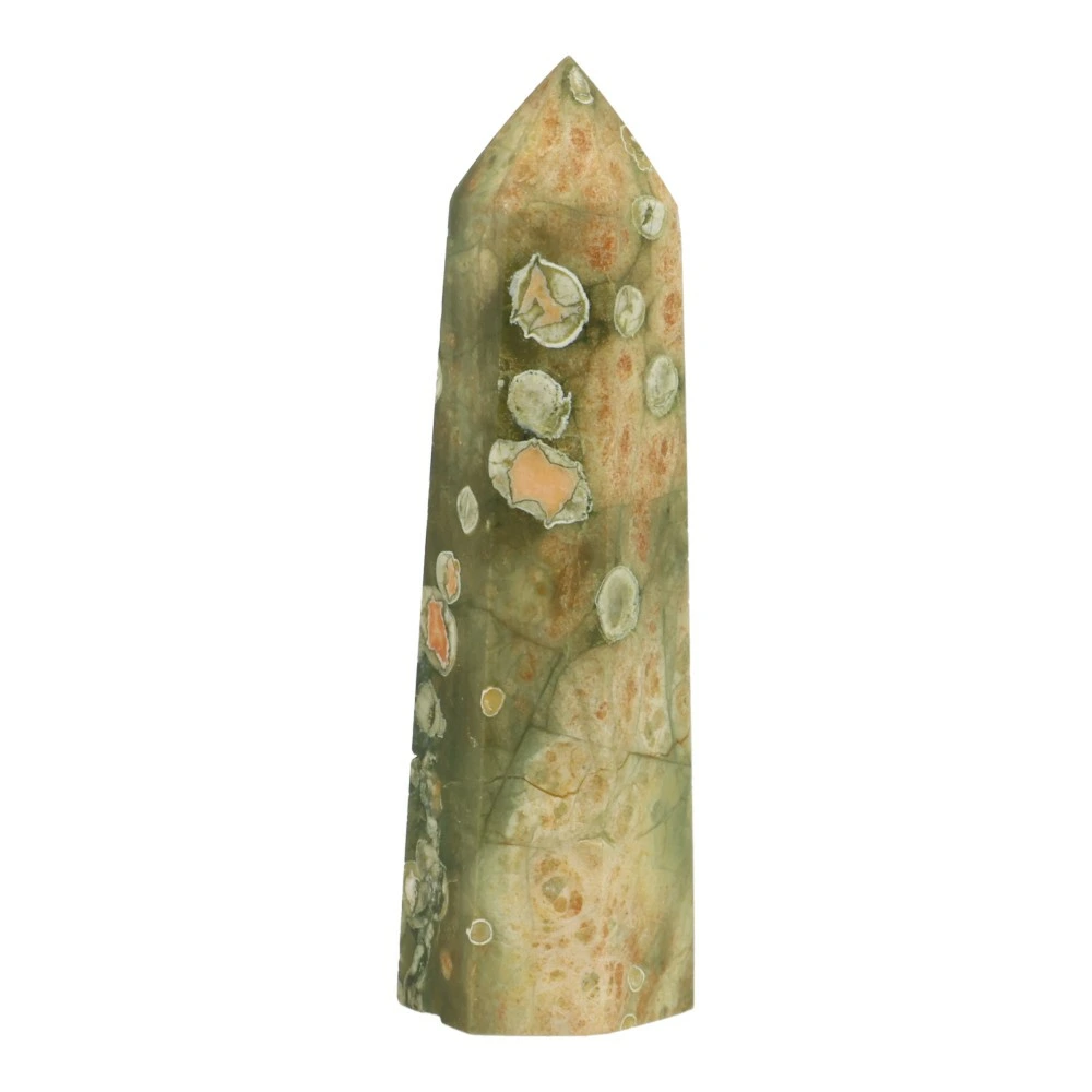 Prachtige rhyoliet toren met fraaie tekening. Rhyoliet wordt ook wel regenwoudjaspis genoemd. Je ontvangt de rhyoliet toren van de foto. De afmeting is ongeveer 88mm hoog met een basis van 22 x 22mm.