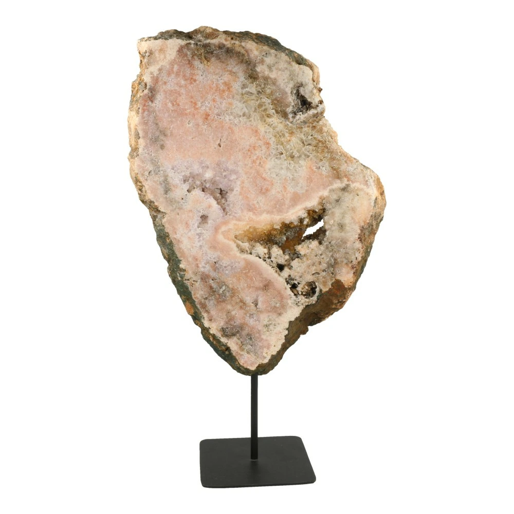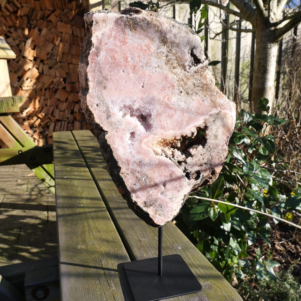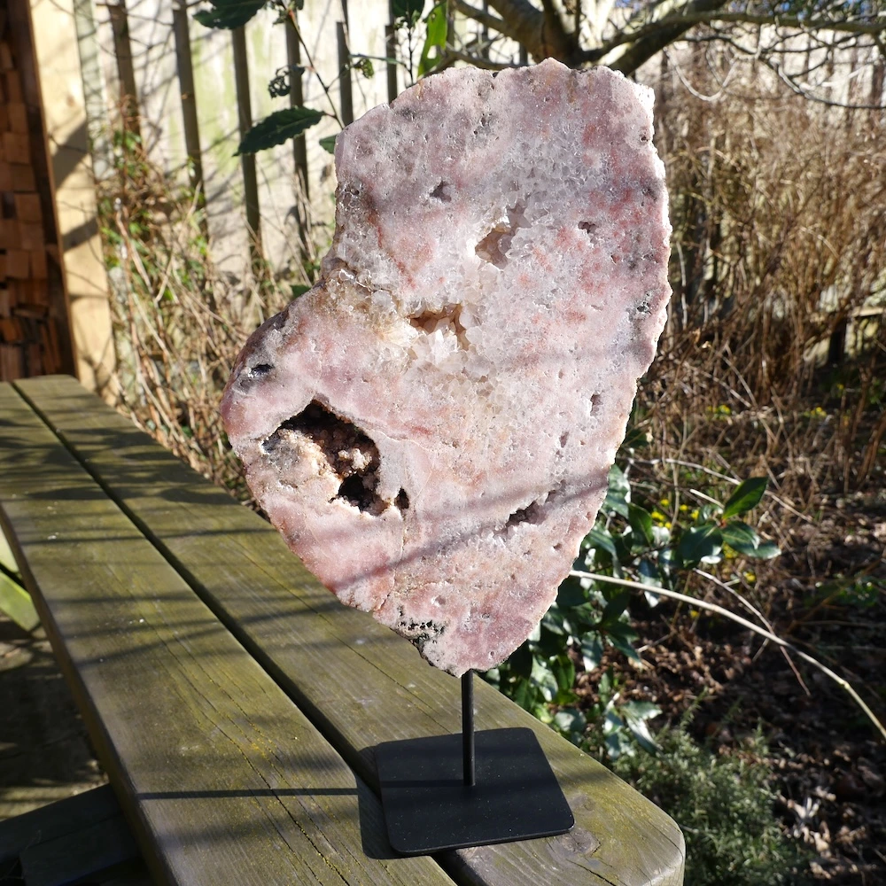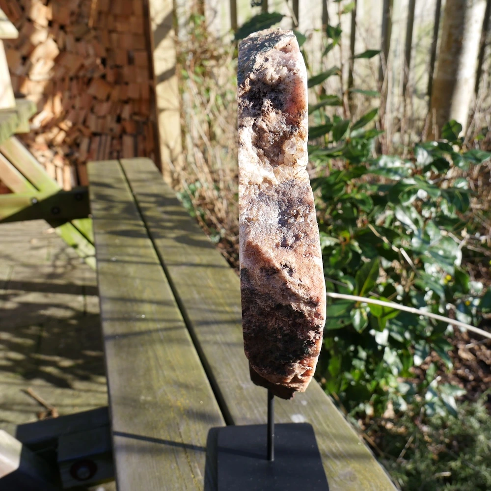 Fraaie schijf van roze amethist op metalen standaard. Beide zijdes van de roze amethist op standaard zijn fraai gepolijst en hebben een net een andere tekening met holtes met mooi glimmende kristallen. De afmeting van deze roze amethist op standaard is ongeveer 37cm hoog (inclusief voet), 22cm breed en 4,8cm dik. Deze roze amethist bevat natuurlijke holte’s met kristallen. De vindplaats is Brazilië. Dit is feitelijk een roze chalecoonvariant. Je ontvangt de roze amethist op standaard van de foto.
