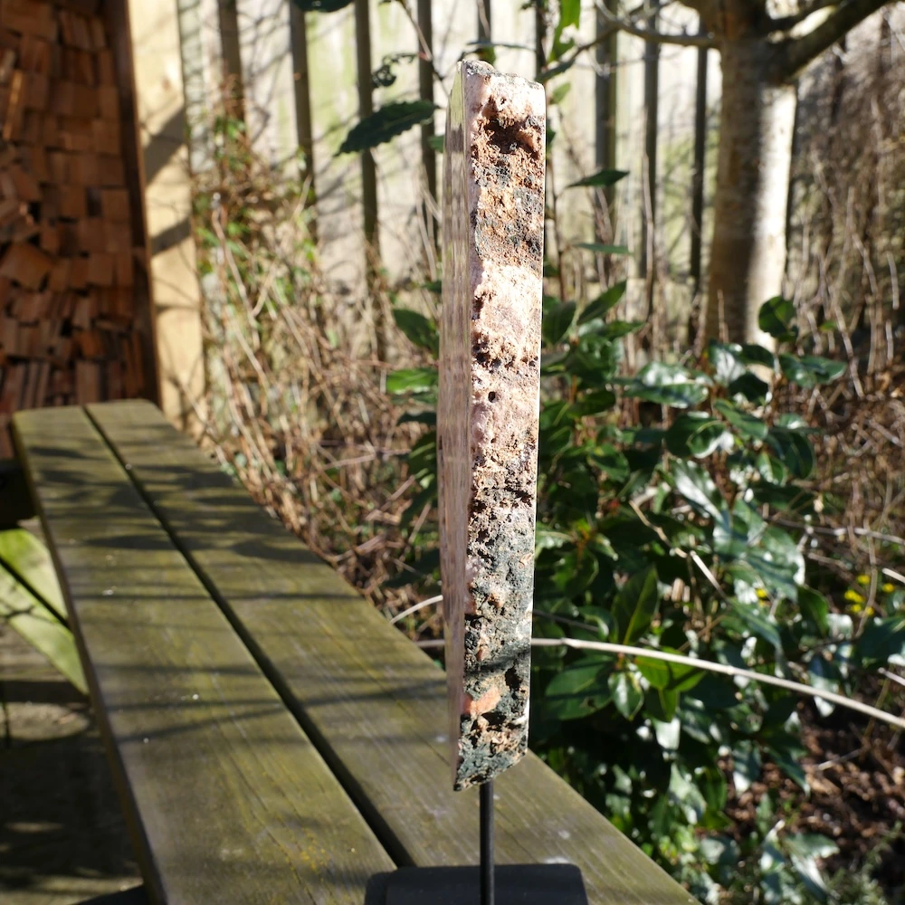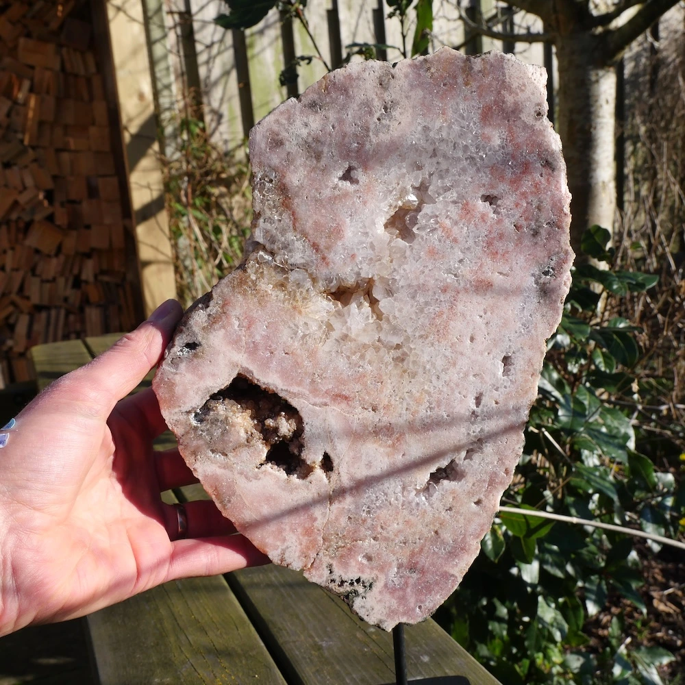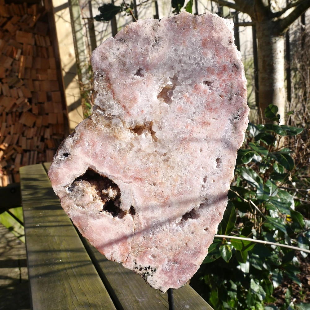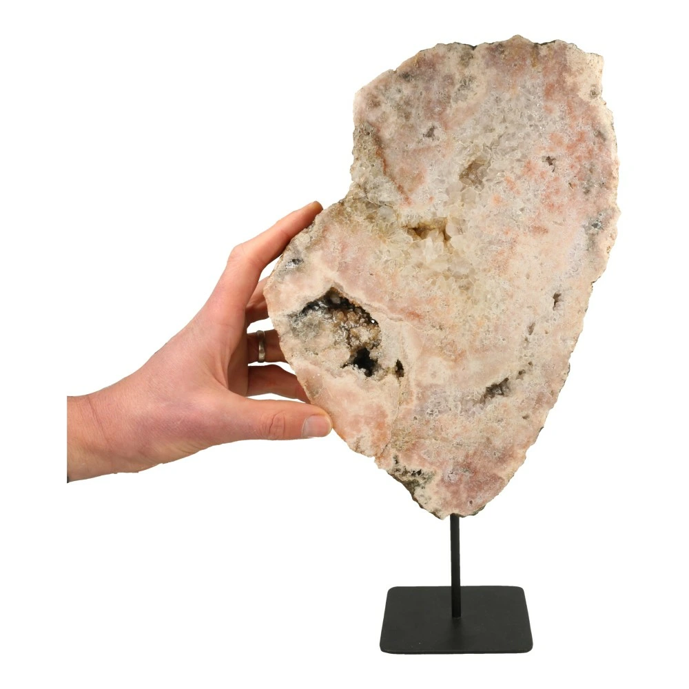 Fraaie schijf van roze amethist op metalen standaard. Beide zijdes van de roze amethist op standaard zijn fraai gepolijst en hebben een net een andere tekening met holtes met mooi glimmende kristallen. De afmeting van deze roze amethist op standaard is ongeveer 37cm hoog (inclusief voet), 22cm breed en 4,8cm dik. Deze roze amethist bevat natuurlijke holte’s met kristallen. De vindplaats is Brazilië. Dit is feitelijk een roze chalecoonvariant. Je ontvangt de roze amethist op standaard van de foto.
