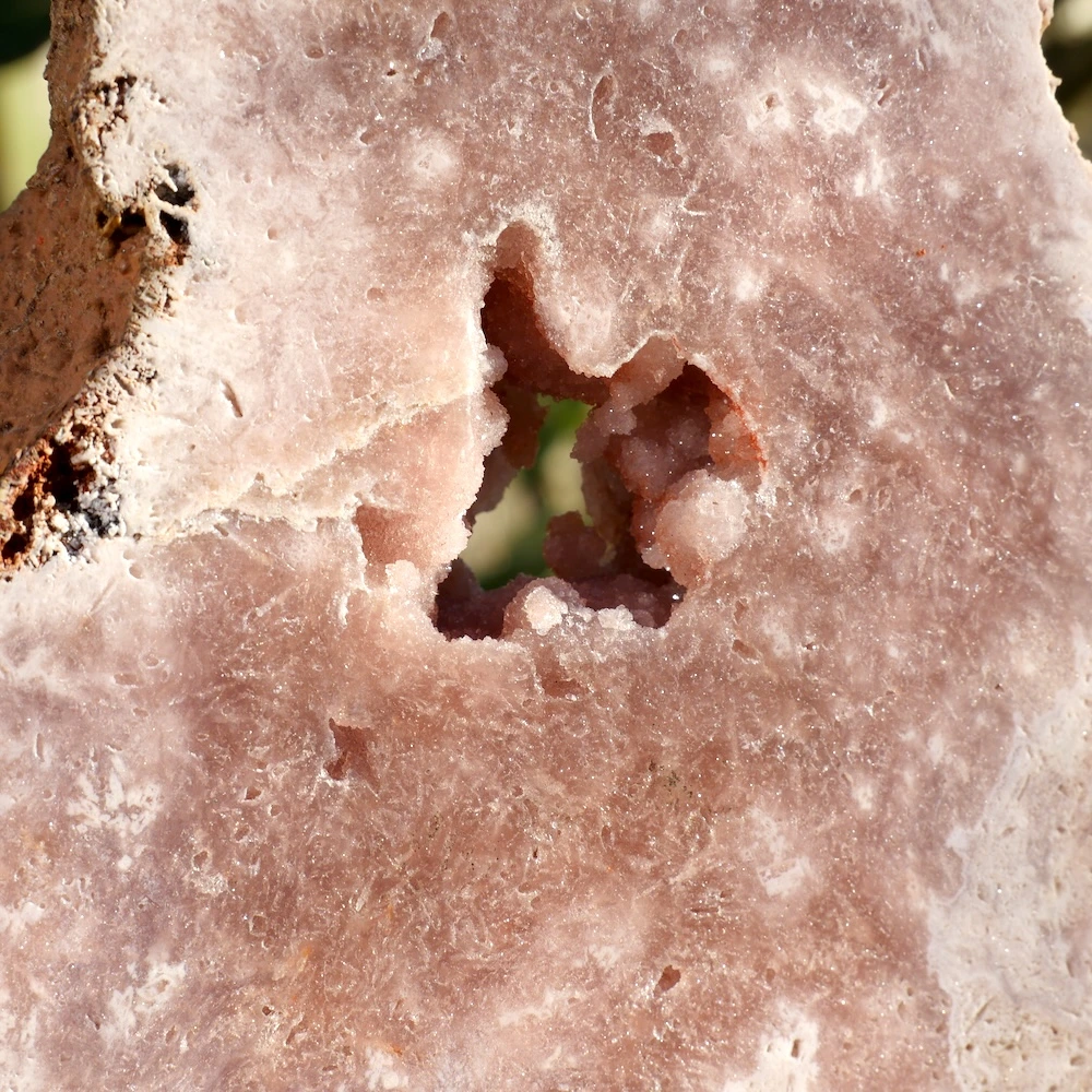 Roze chalcedoon uit Brazilië werkt meer aardend op het spirituele lichaam. Ze helpt je om spirituele inzichten op een zachte manier te integreren en ondersteunt je om je veilig te voelen tijdens spirituele groei. De steen brengt rust in je energetisch veld.