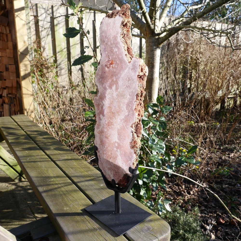 Fraaie schijf van roze amethist op metalen standaard. Beide zijdes van de roze amethist op standaard zijn fraai gepolijst en hebben een net een andere tekening met holtes met mooi glimmende kristallen. De afmeting van deze roze amethist op standaard is ongeveer 52,5cm hoog (inclusief voet), 16cm breed en 2,5cm dik. De voet heeft een afmeting van 12x15cm. Deze roze amethist bevat natuurlijke holte’s met kristallen. De vindplaats is Brazilië. Dit is feitelijk een roze chalecoonvariant. Je ontvangt de roze amethist op standaard van de foto.