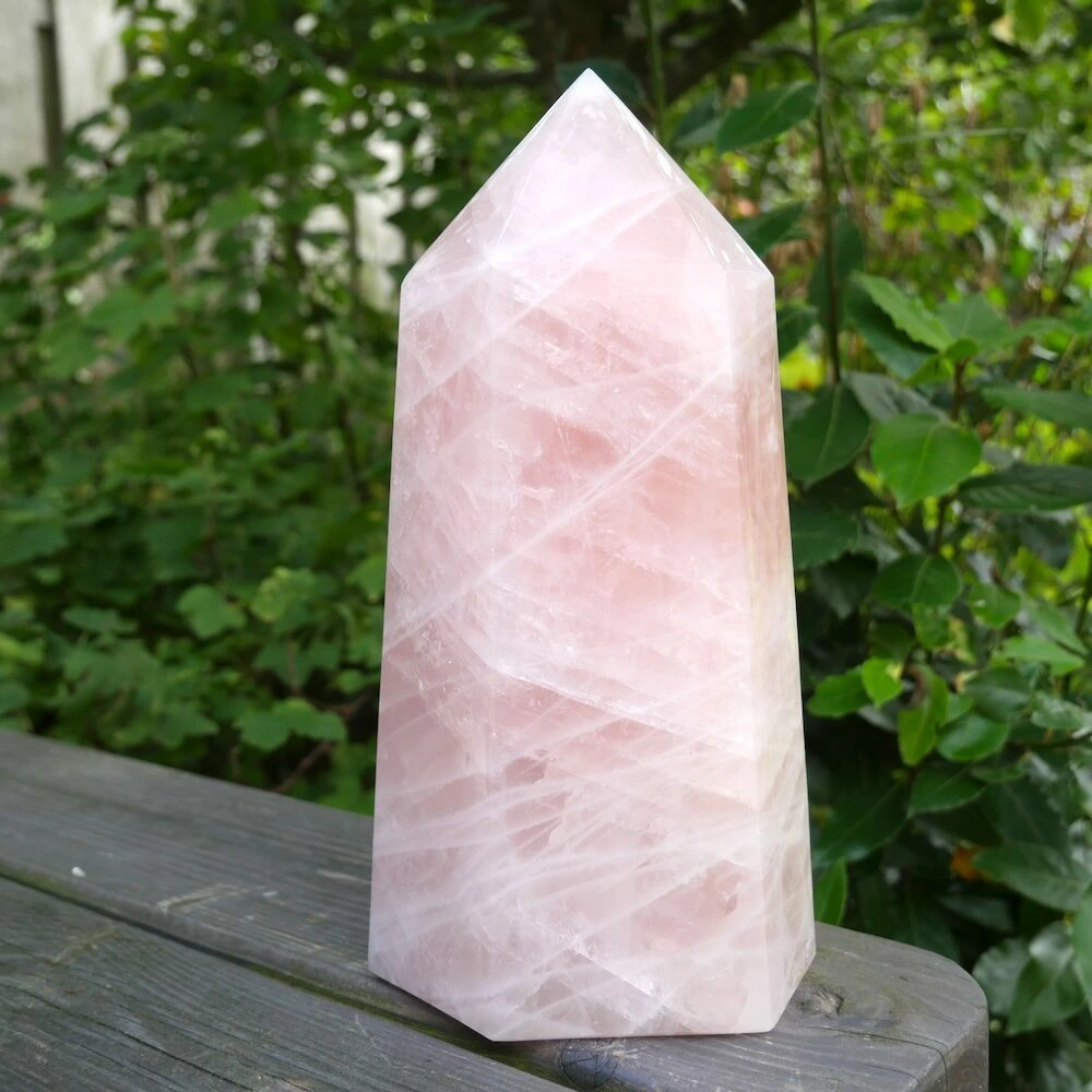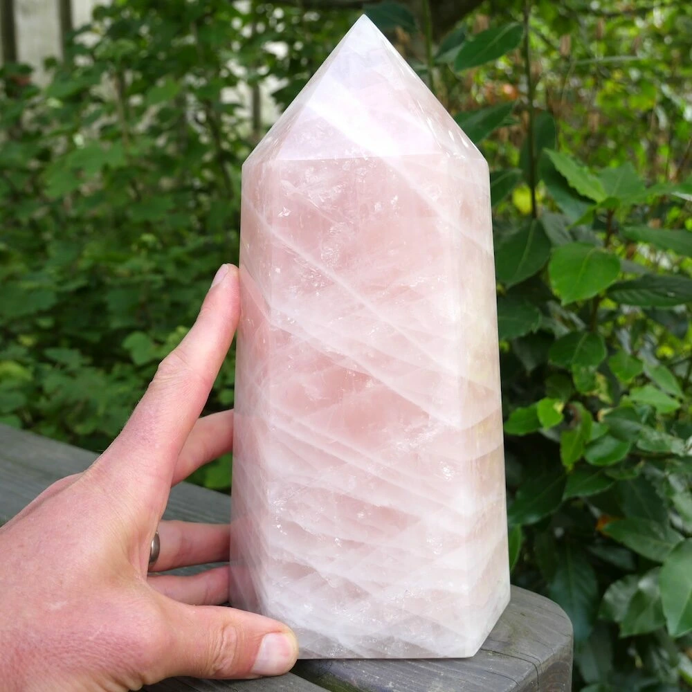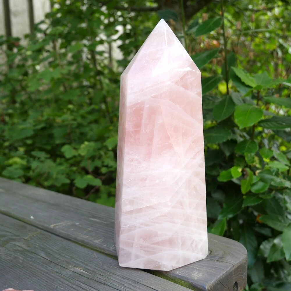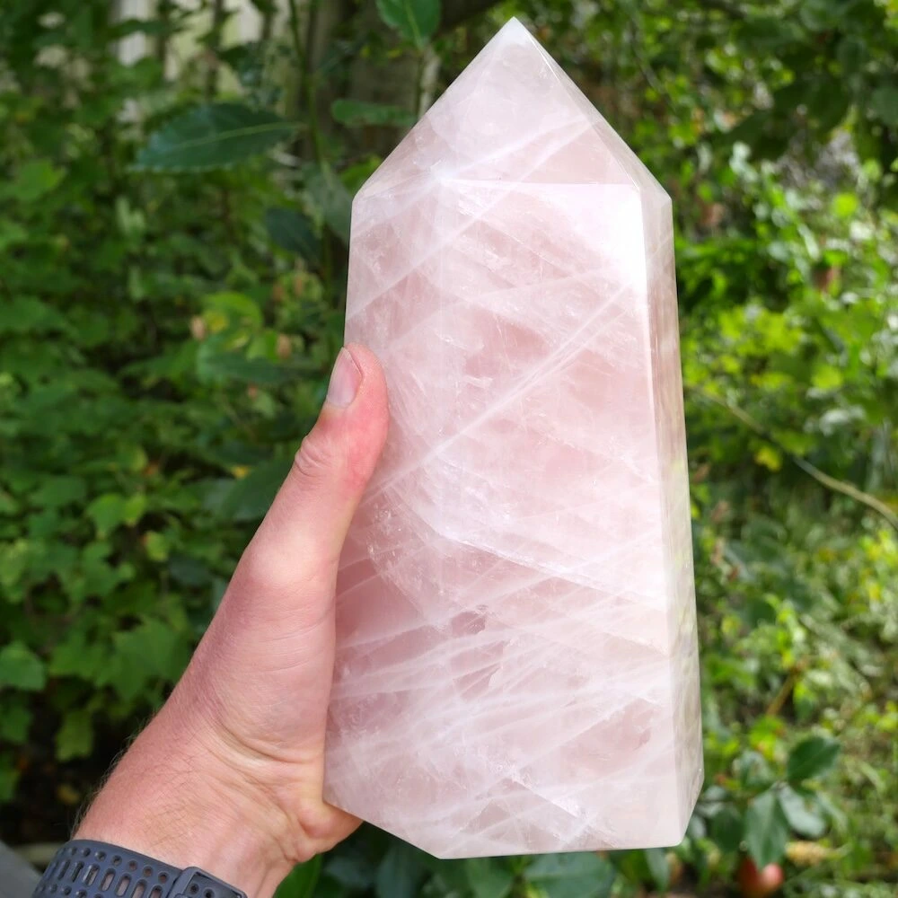 Unieke grote rozenkwarts punt XL uit Madagaskar met een heldere en stevige energie. De afmeting van deze flinke rozenkwarts punt is circa 25,5 cm hoog, met een basis van 12,5 x 9,5 cm. Deze fraaie punt staat stevig te stralen en nodigt jou uit hetzelfde te doen. Vanuit je basis je hart laten spreken en de liefde laten stromen. Een fijne aanwezigheid om de energie in de ruimte naar het hart te brengen en het hart te laten spreken. Vanuit stevigheid, lekker in je lichaam en in balans. Daarnaast brengt deze rozenkwarts een veld van bescherming door zijn duidelijke aanwezigheid. En wat is nu een fijnere bescherming dan de energie van liefde? Je ontvangt de rozenkwarts punt van de foto.