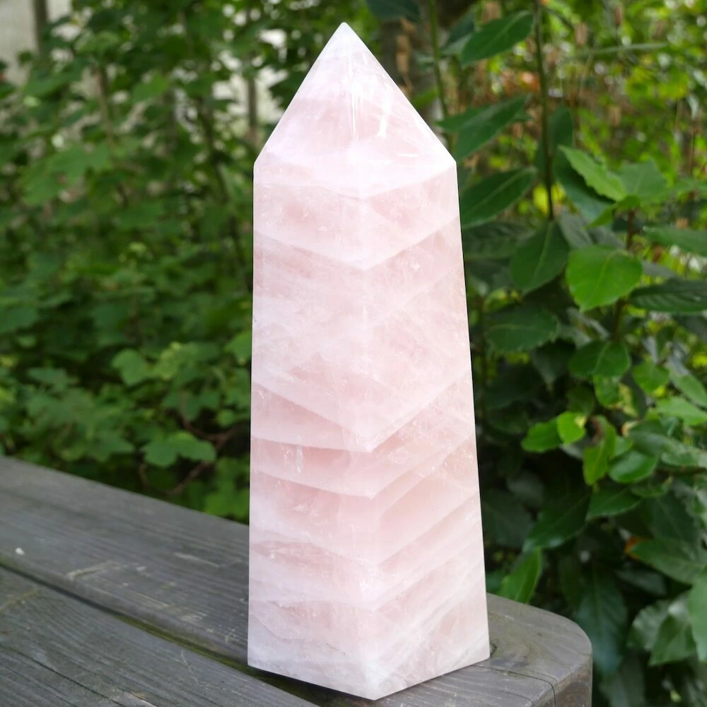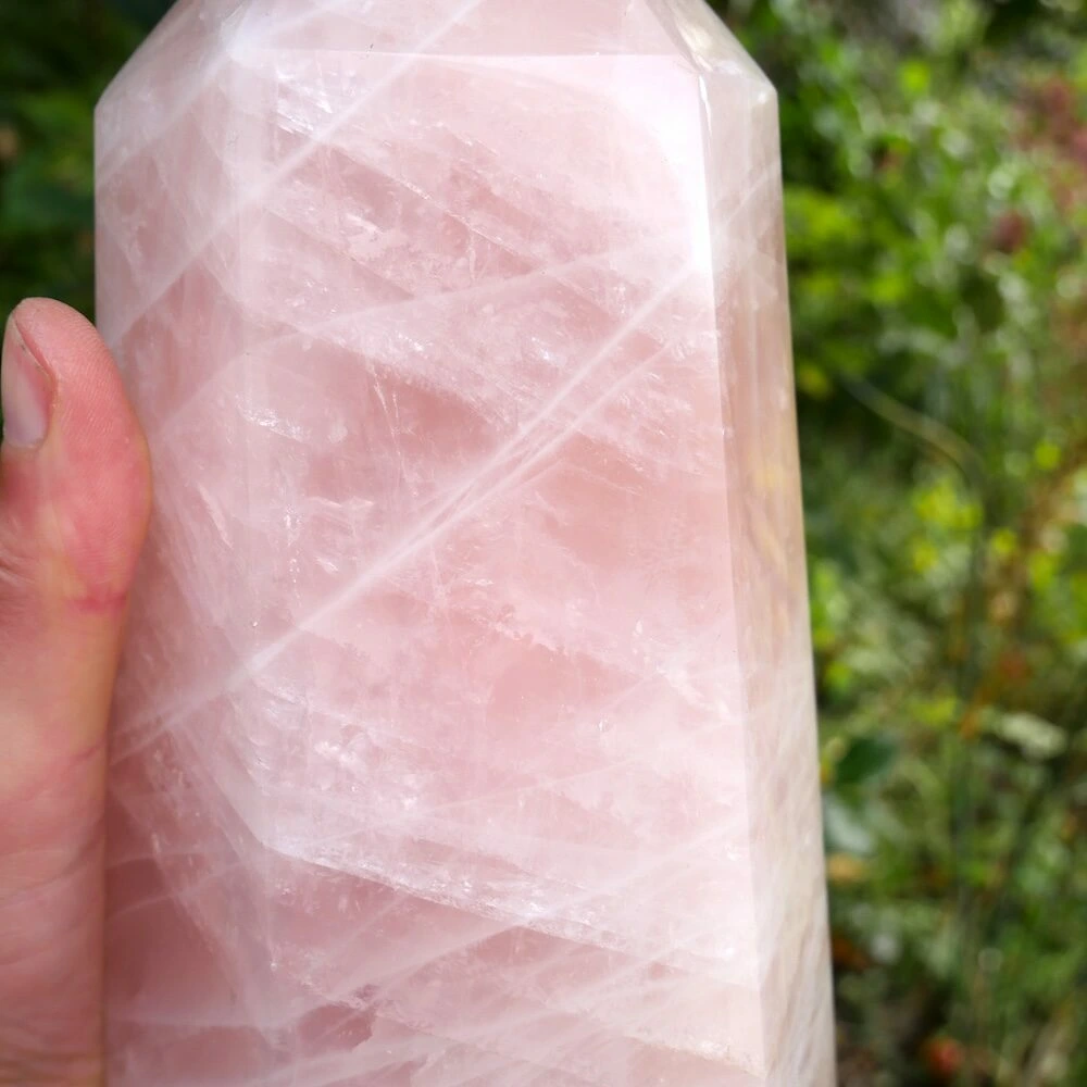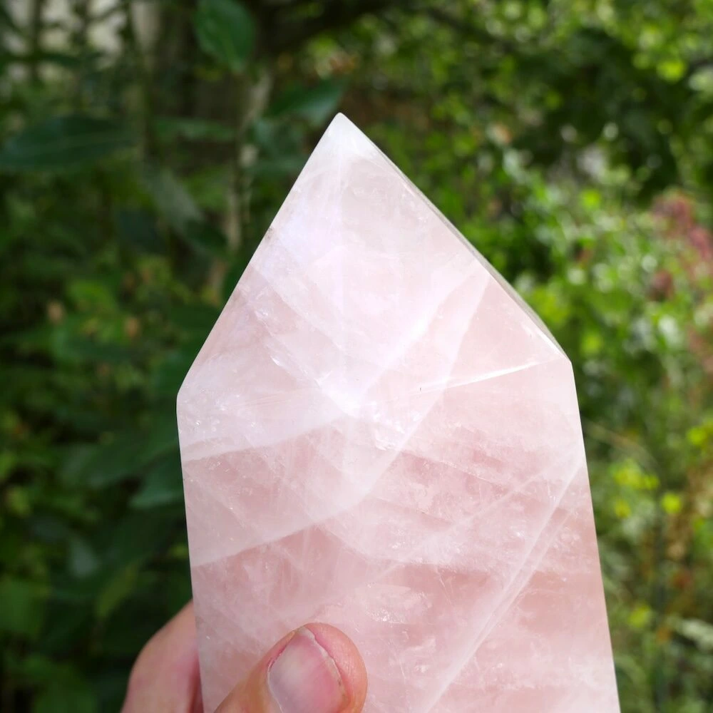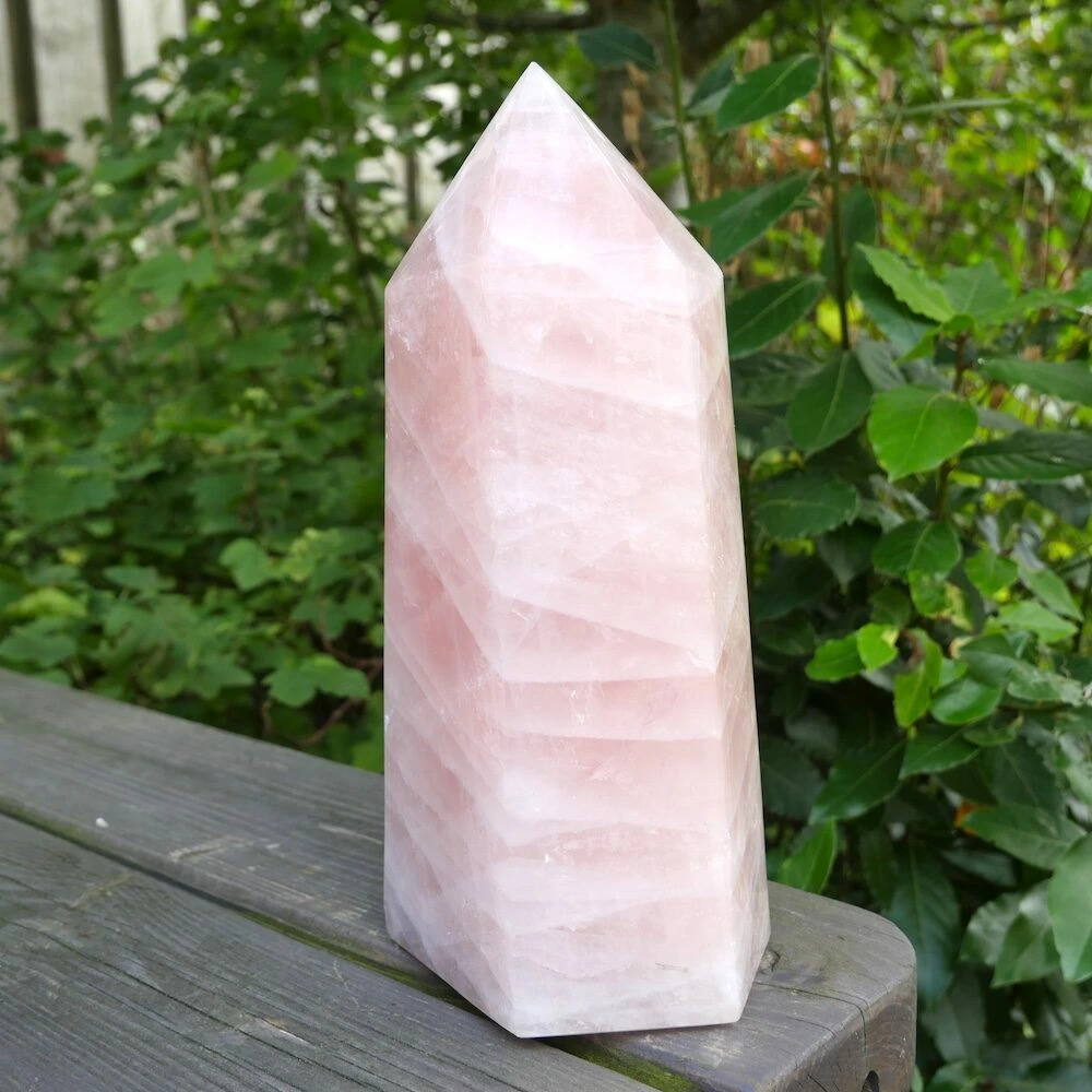 Unieke grote rozenkwarts punt XL uit Madagaskar met een heldere en stevige energie. De afmeting van deze flinke rozenkwarts punt is circa 25,5 cm hoog, met een basis van 12,5 x 9,5 cm. Deze fraaie punt staat stevig te stralen en nodigt jou uit hetzelfde te doen. Vanuit je basis je hart laten spreken en de liefde laten stromen. Een fijne aanwezigheid om de energie in de ruimte naar het hart te brengen en het hart te laten spreken. Vanuit stevigheid, lekker in je lichaam en in balans. Daarnaast brengt deze rozenkwarts een veld van bescherming door zijn duidelijke aanwezigheid. En wat is nu een fijnere bescherming dan de energie van liefde? Je ontvangt de rozenkwarts punt van de foto.