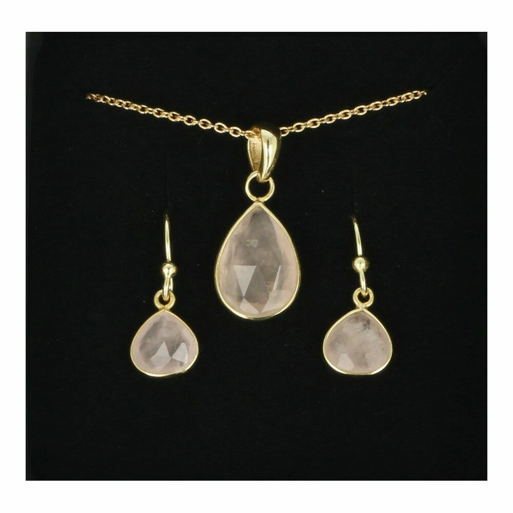 Fijne rozenkwarts sieraden set in goud, prachtig om jezelf of iemand anders cadeau te doen. De set bestaat uit een facet geslepen hanger in goud aan een ketting van 45cm lengte. Om de set compleet te maken zit er een paar oorhangers met facet geslepen rozenkwarts bij. Zowel de hanger als de oorbellen zijn gemaakt van verguld zilver (juwelierskwaliteit 925 sterling zilver), dus met een dun laagje goud. De ketting is gold-filled, dat heeft een dikkere laag goud op zilver voor extra duurzaamheid. De kleur roze is in het echt nog mooier dan op de foto. Je ontvangt de rozenkwarts sieraden set in goud van de foto. De afmeting van de steen in de hanger is ongeveer 10mm breed en 15mm hoog. De oorbel heeft een rozenkwarts van ongeveer 8x8mm.