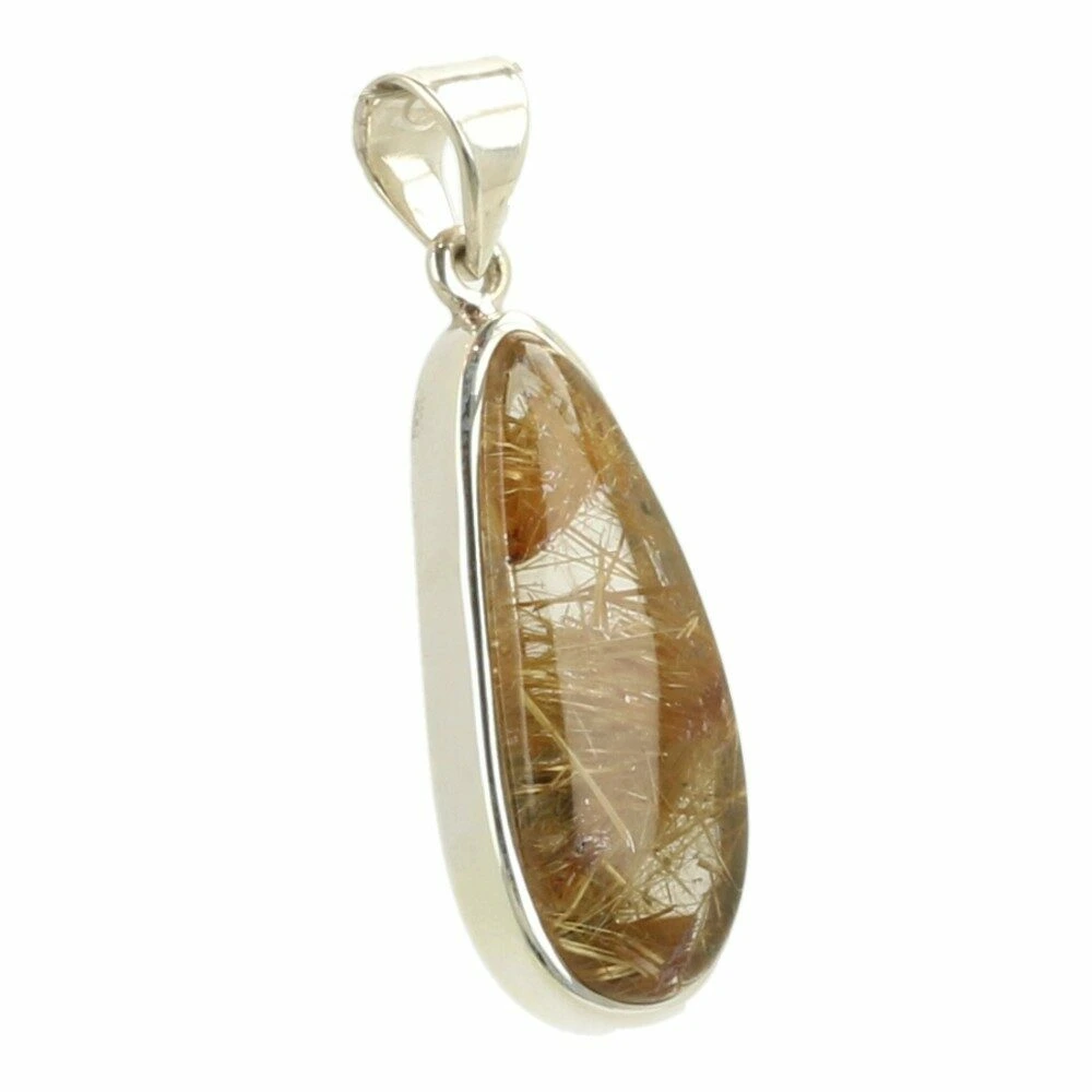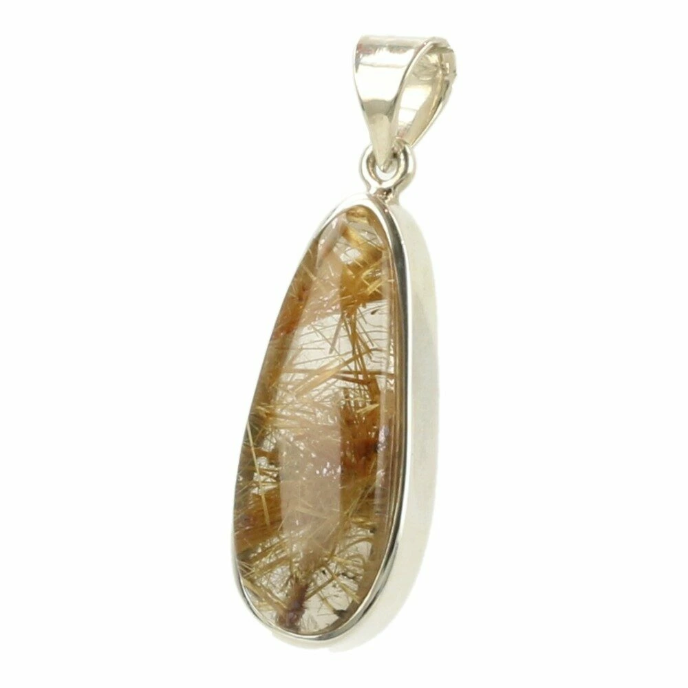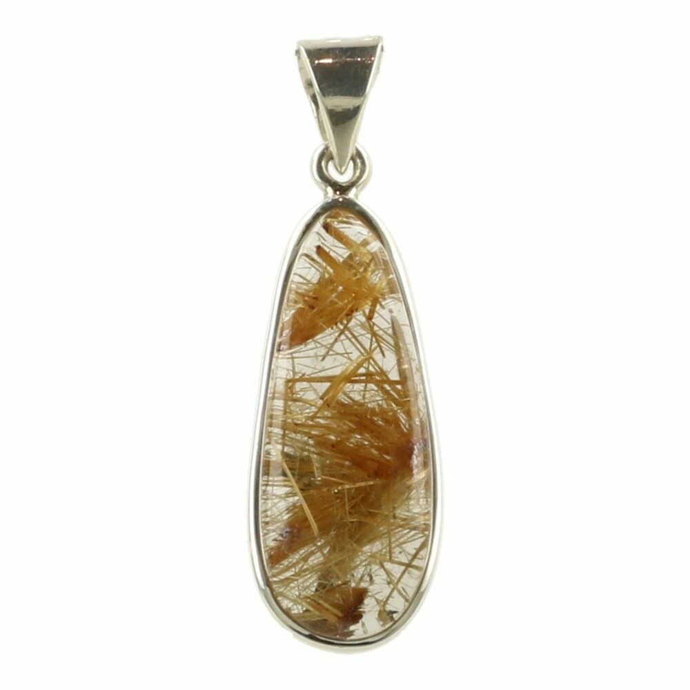 Fraaie bolgeslepen rutielkwarts hanger met grote goudkleurige rutielnaaldjes, gemaakt van 100% juwelierskwaliteit 925 sterling zilver. Je kunt de gouden rutielnaaldjes goed zien in de heldere bergkristal. De afmeting van de rutielkwarts in de hanger is ongeveer 28mm hoog en 11mm breed. Je ontvangt de gouden rutielkwarts hanger in zilver van de foto.