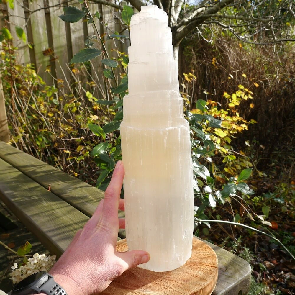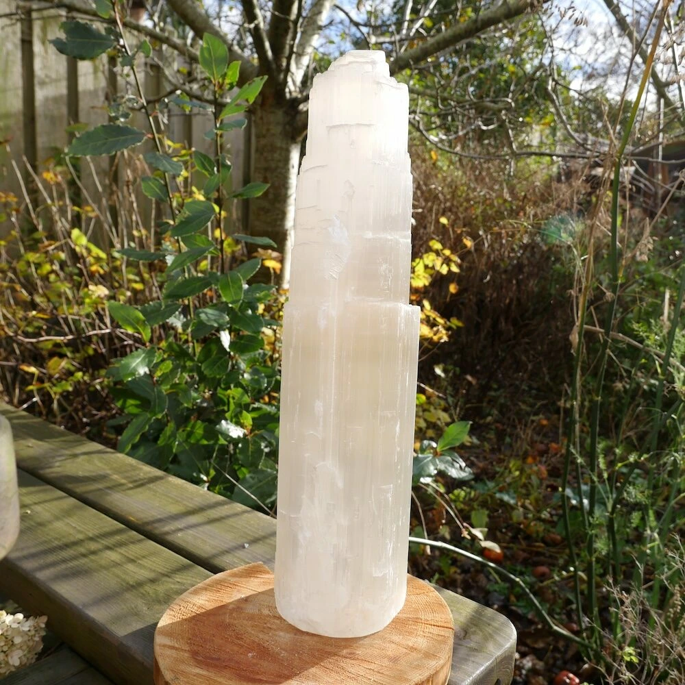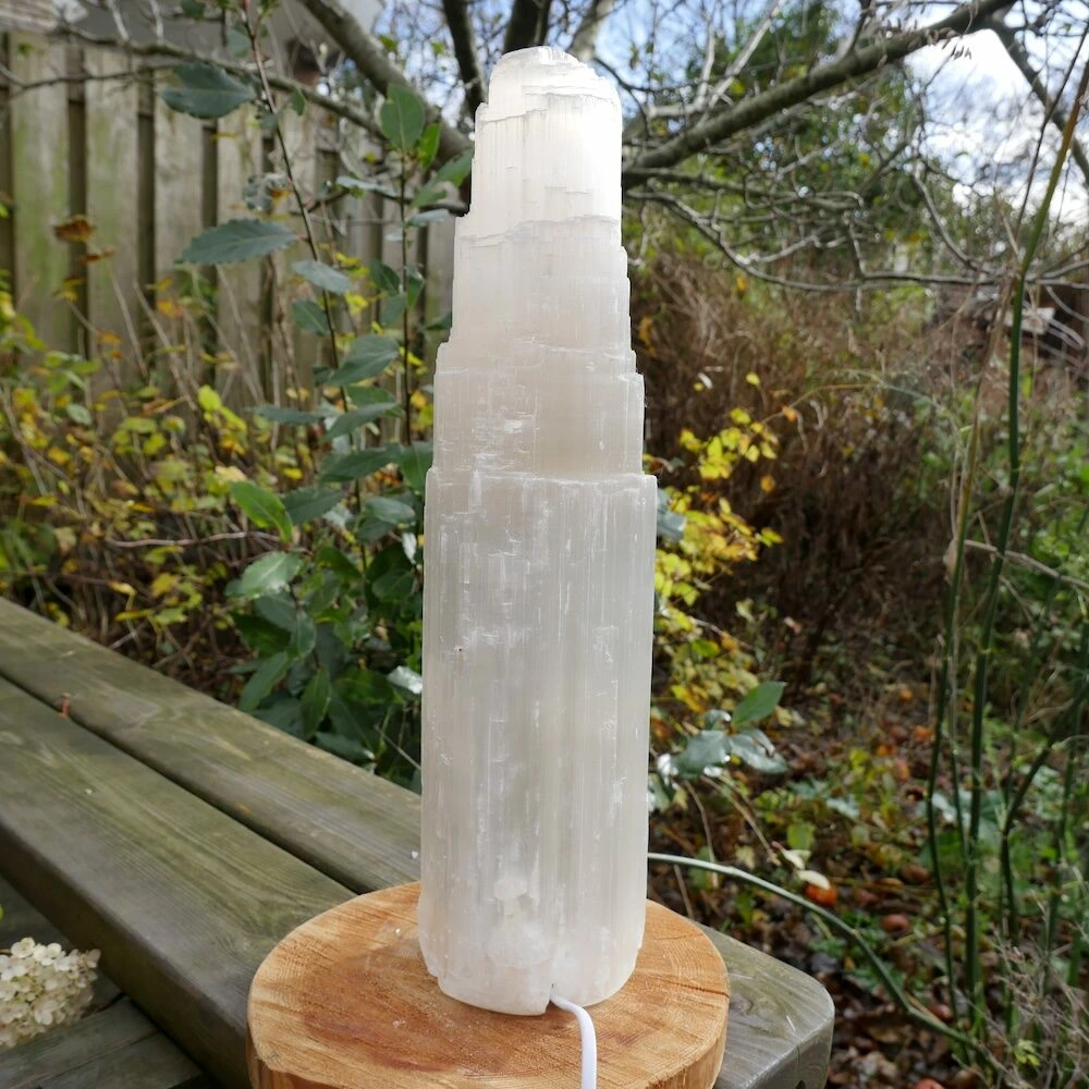 Fijne seleniet lamp uit ruwe seleniet (satijnspaat). De afmetingen van de seleniet lamp varieert, omdat het uit ruwe seleniet is gemaakt. Ze zijn ongeveer 40cm hoog en 10-11cm breed. Je ontvangt deze seleniet lamp met netsnoer en bolletje, zodat je meteen gebruik kunt maken van dit fijne sfeerlicht. Zowel overdag als ’s avonds een fijne aanwezigheid en decoratie.