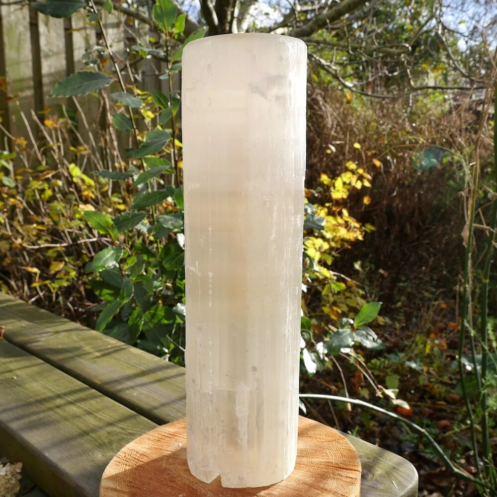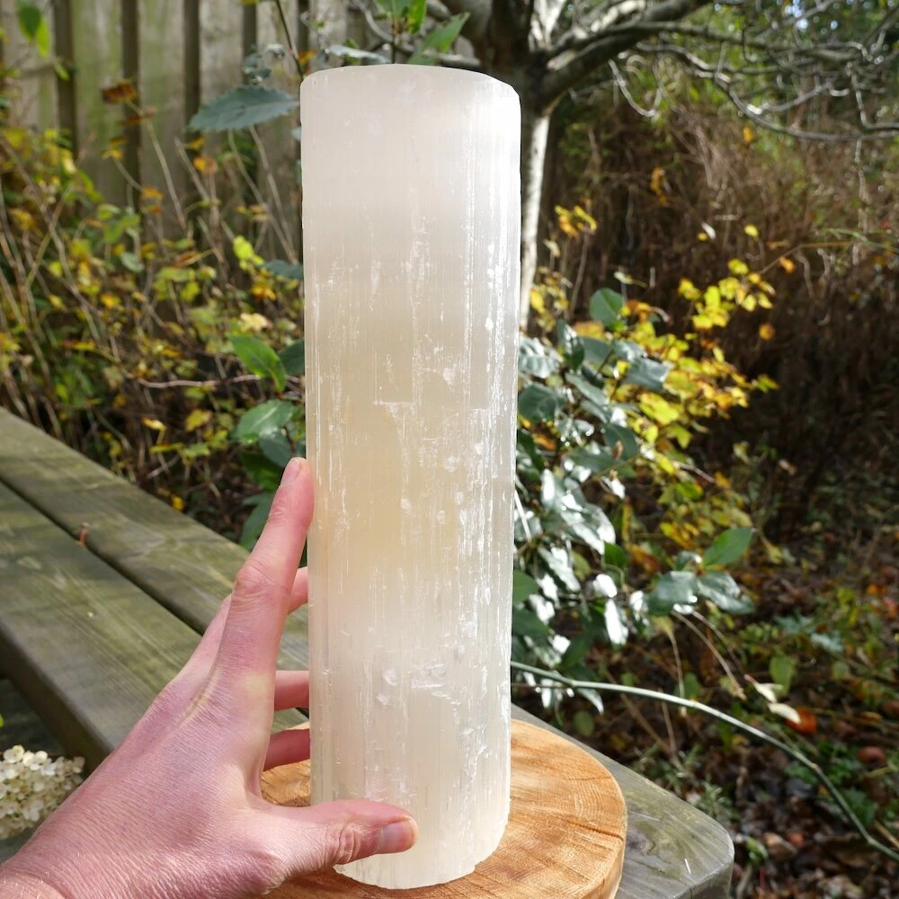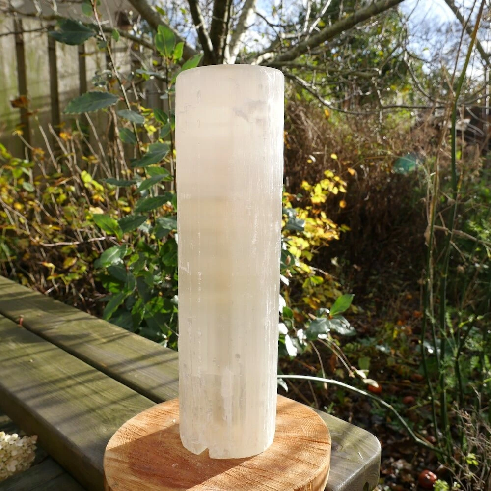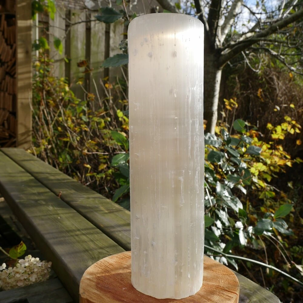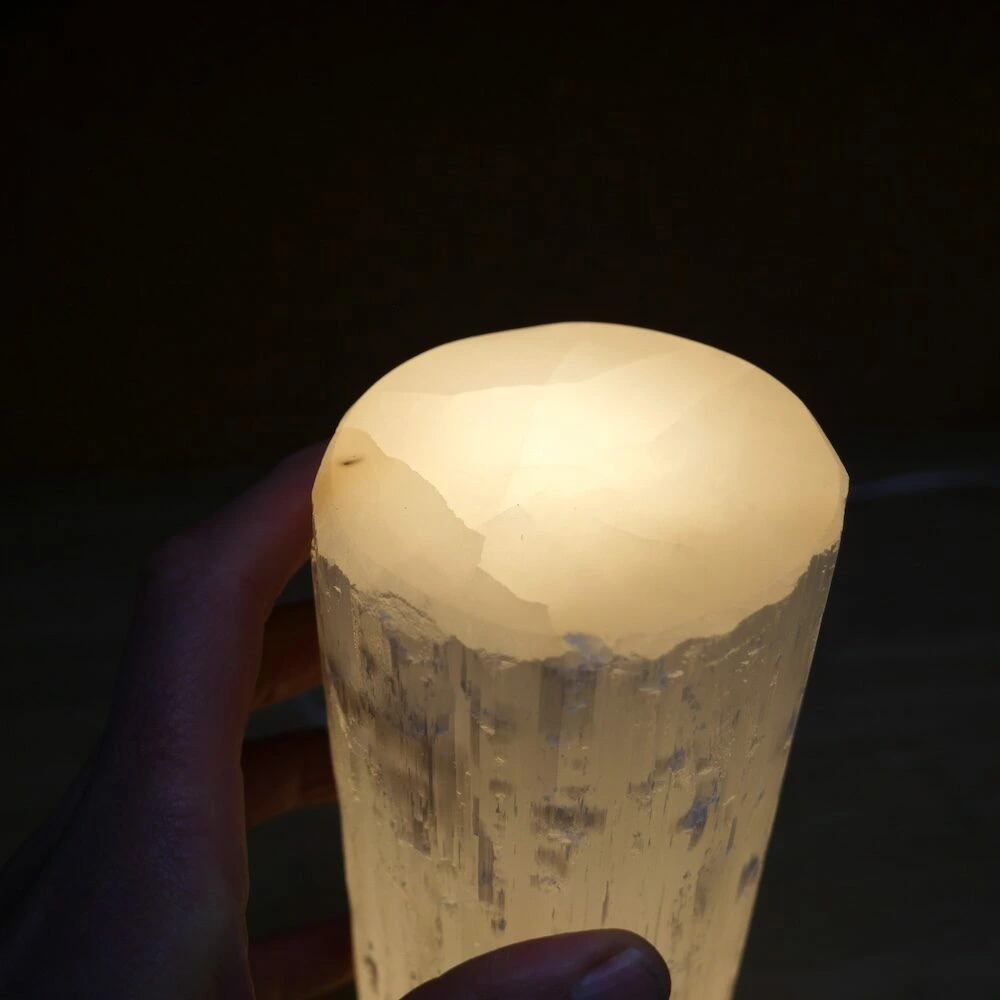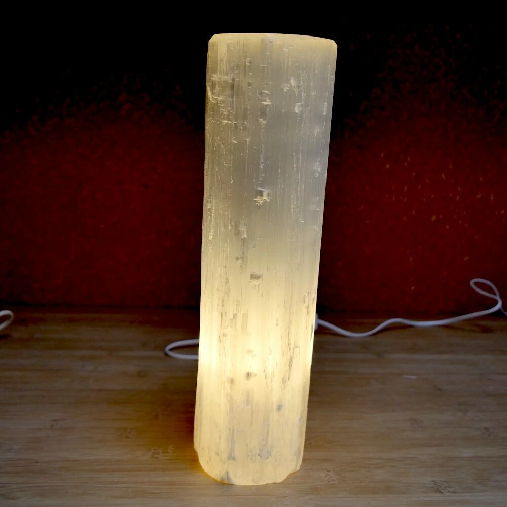 Fijne seleniet lamp cilinder uit ruwe seleniet (satijnspaat) met een vlakke bovenkant. De afmetingen van de seleniet lamp varieert, omdat het uit ruwe seleniet is gemaakt. Ze zijn ongeveer 33-35cm hoog en 9-10cm breed. Je ontvangt deze seleniet lamp met netsnoer en bolletje, zodat je meteen gebruik kunt maken van dit fijne sfeerlicht. Zowel overdag als ’s avonds een fijne aanwezigheid en decoratie.