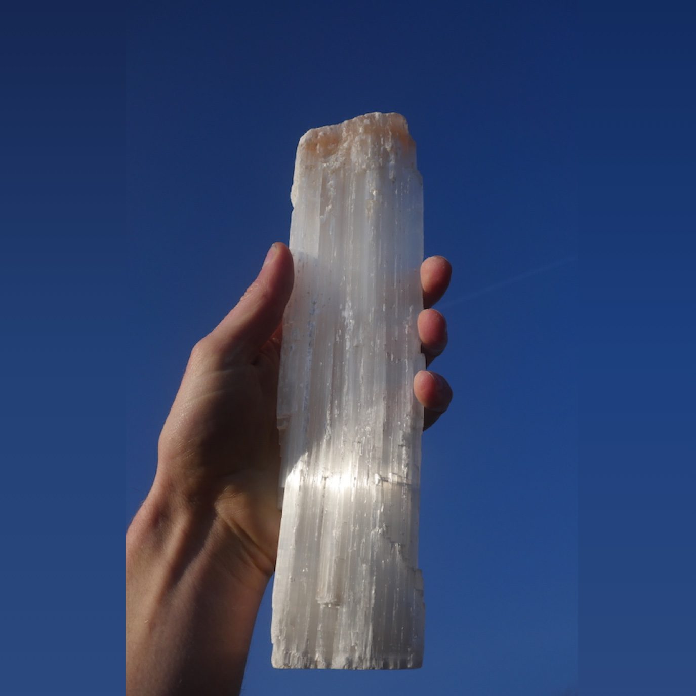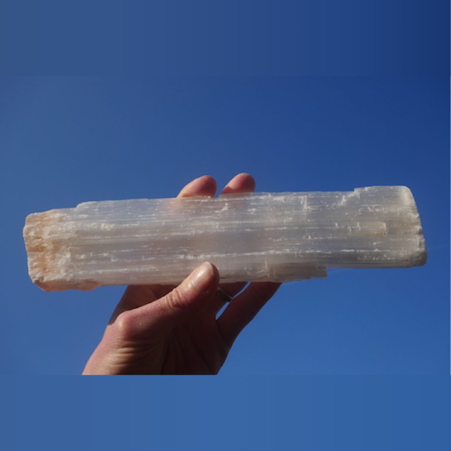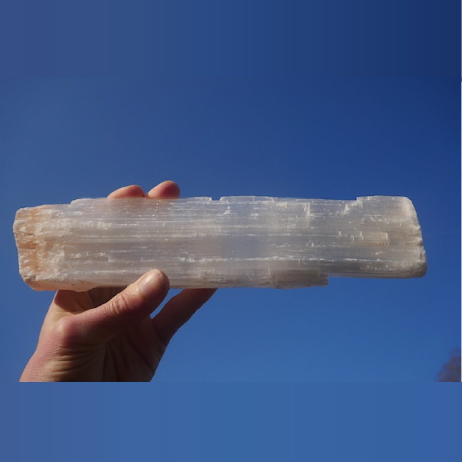 Fijne seleniet staaf maat XL (satijnspaat). De afmetingen van de seleneit staaf XL kunnen nogal variëren in breedte en lengte. Gemiddeld zijn deze seleniet staven XL ongeveer 35-40 cm lang, 4-7 cm breed en 2-4 cm dik.