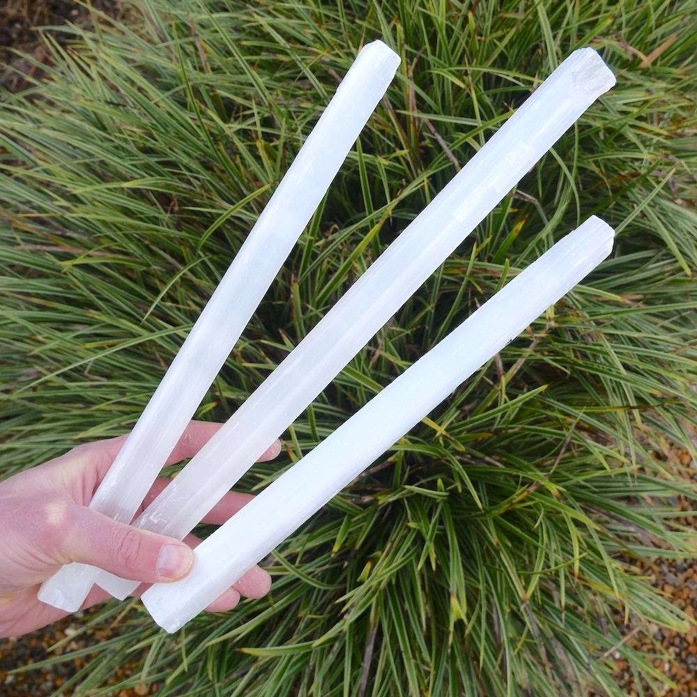 Fijne lange seleniet staaf ruw (satijnspaat). Gemiddeld zijn deze seleniet staven ruw ongeveer 35-40 cm lang, 2-2,5cm breed en 2-3 cm dik.
