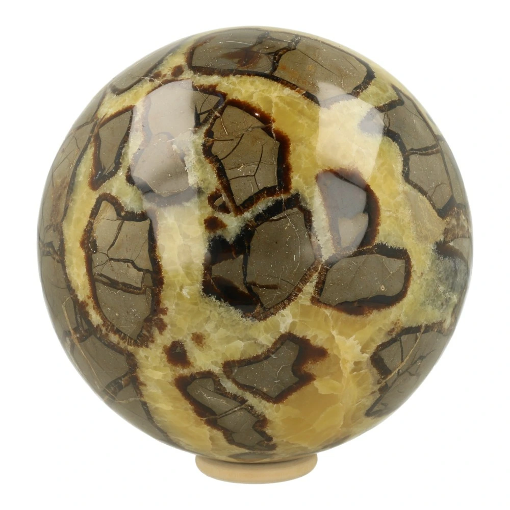 Deze mooie gepolijste septarie bol uit Madagaskar heeft een gewicht van 6,19 kg en een diameter van 16,4 cm. De bol heeft een mooi lijnenspel en een hele heldere en frisse energie.
