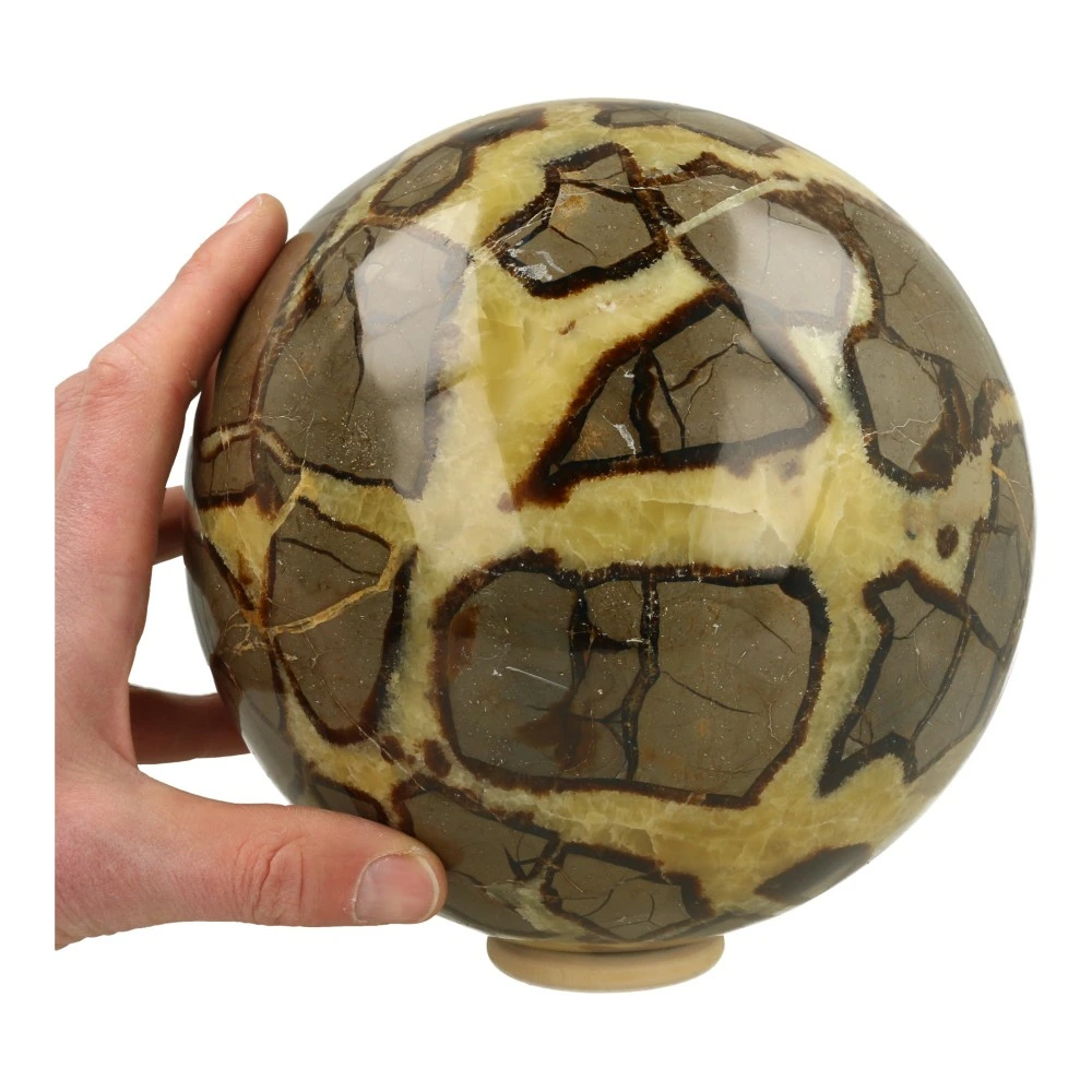 Deze mooie gepolijste septarie bol uit Madagaskar heeft een gewicht van 11,4 kg en een diameter van ongeveer 20cm. De bol heeft een mooi lijnenspel en een hele heldere en frisse energie. De bol brengt sprankeling en openheid met zich mee, en verbind alle wezens in de ruimte met elkaar vanuit het bewustzijn dat we allemaal onderdeel uit maken van het grotere geheel. Deze bijzondere septarie bol XL heeft ook mooie holtes met gekristalliseerde calciet. Ook de kristallisatievormen in het gele calciet rondom de versteende klei is bij deze beauty heel mooi te zien. Deze bol is echt een sieraad in elke ruimte kan door zijn heldere en lichte werking in iedere ruimte geplaatst worden. Een eye-catcher die veel doet op de onderstroom!