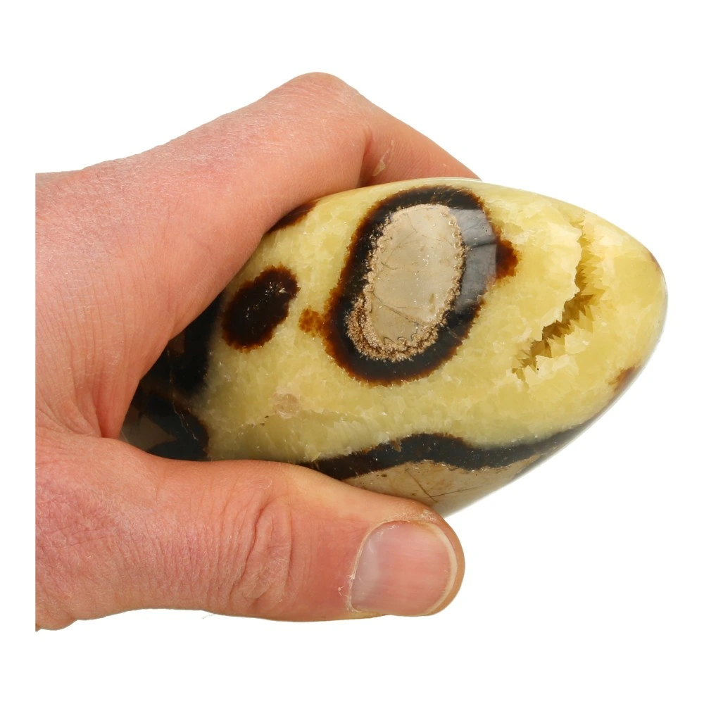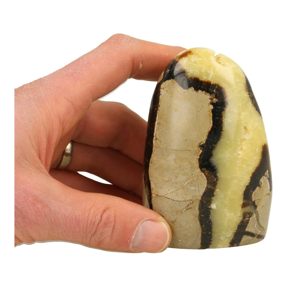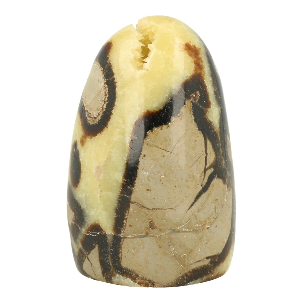 Fraaie gepolijste septarie vrije vorm van ongeveer 98mm hoog, 64mm breed en 53mm diep uit Madagaskar. Fraai getekende vrije vorm om neer te zetten, met een groot contrast tussen de zwarte lijnen en de gele calciet en een fraaie holte met puntige gele calciet kristallen. Je ontvangt de septarie vrije vorm van de foto.
