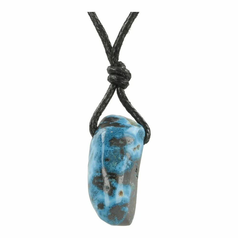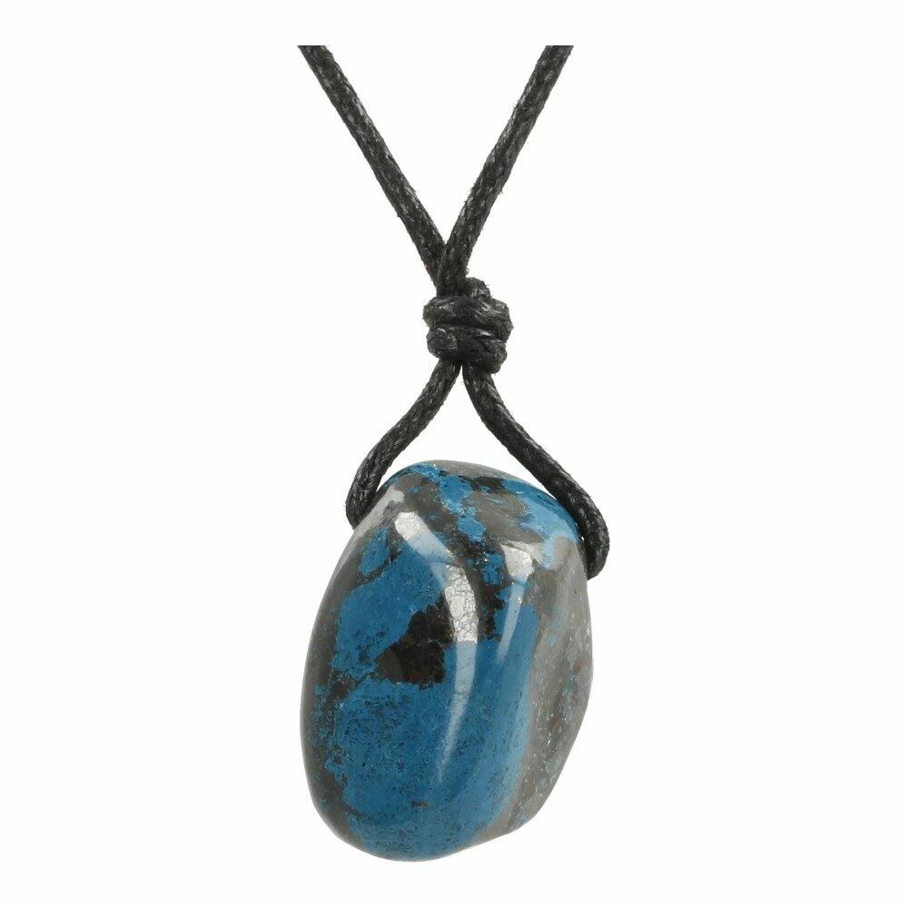 Mooie blauwe shattuckiet hanger doorboord aan zwart waxkoord. Je ontvangt een soortgelijke shattuckiet hanger doorboord als op de foto, de kwaliteit is gelijksoortig aan wat je op de foto’s ziet. De afmetingen zijn ongeveer 2-3cm hoog en 1,5-2cm breed.