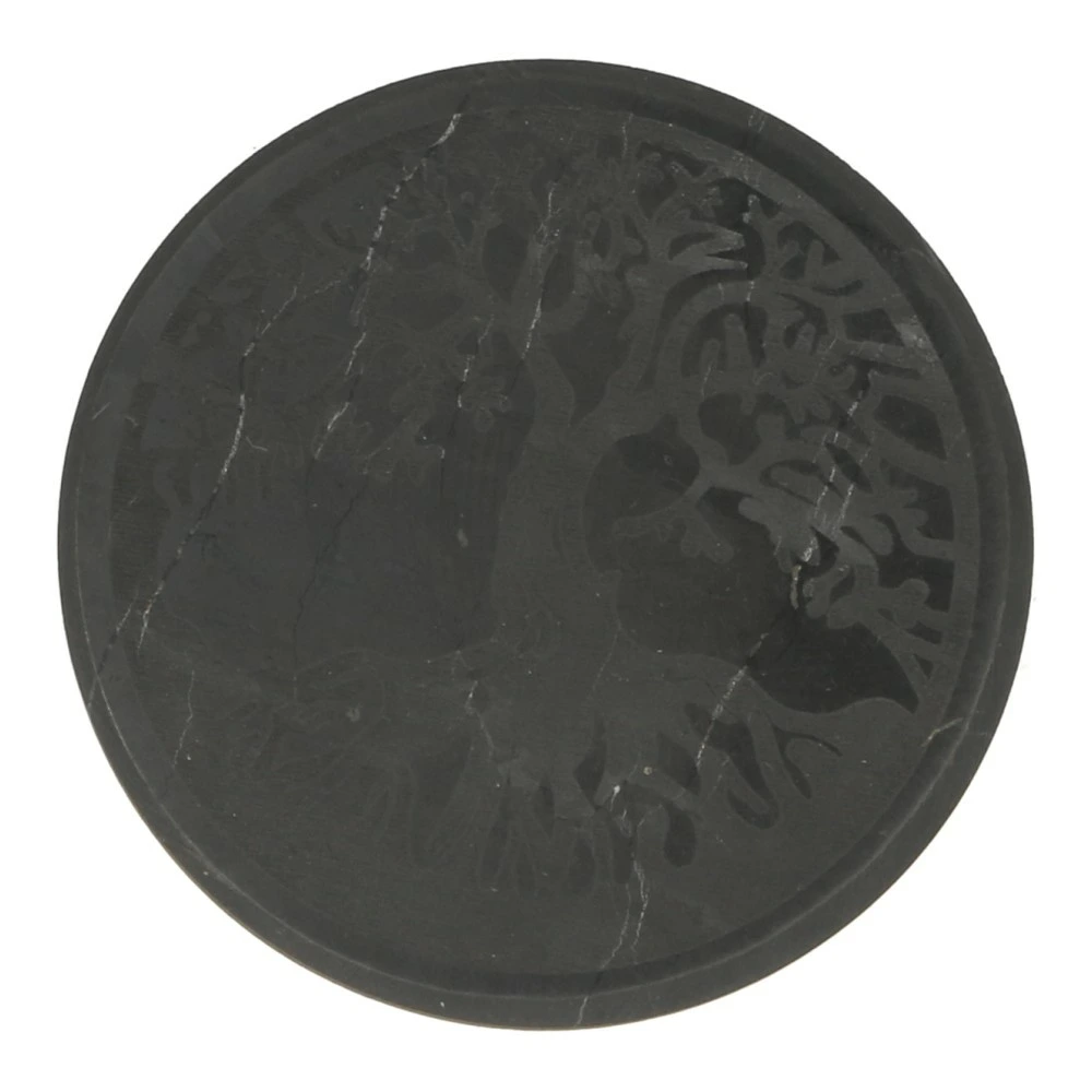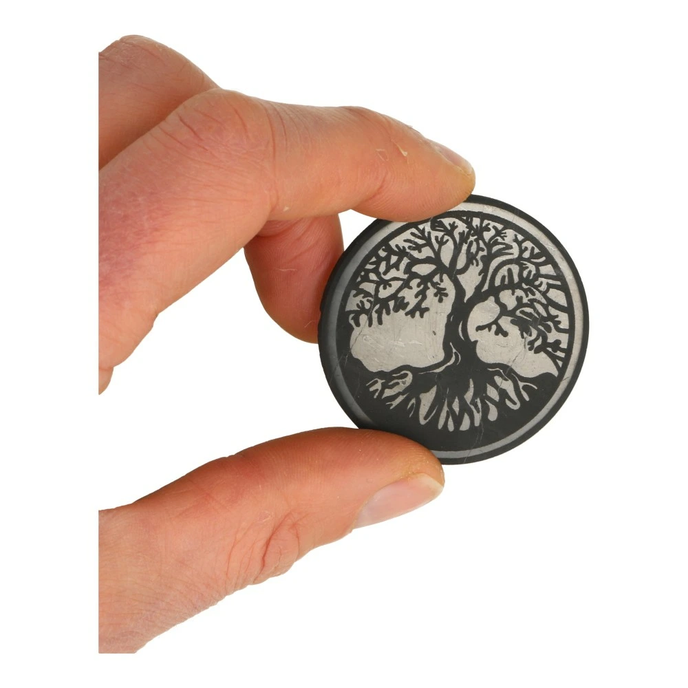 Glanzend zwarte shungiet laptop beschermer met afbeelding van een levensboom. Dit ronde plaatje shungiet met diameter van circa 5cm heeft een plakstrip aan de achterzijde, waardoor je die op je laptop, tablet of computer kunt plakken om de electromagnetische storing te verminderen.