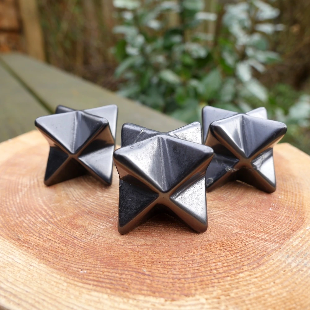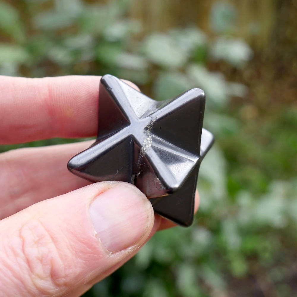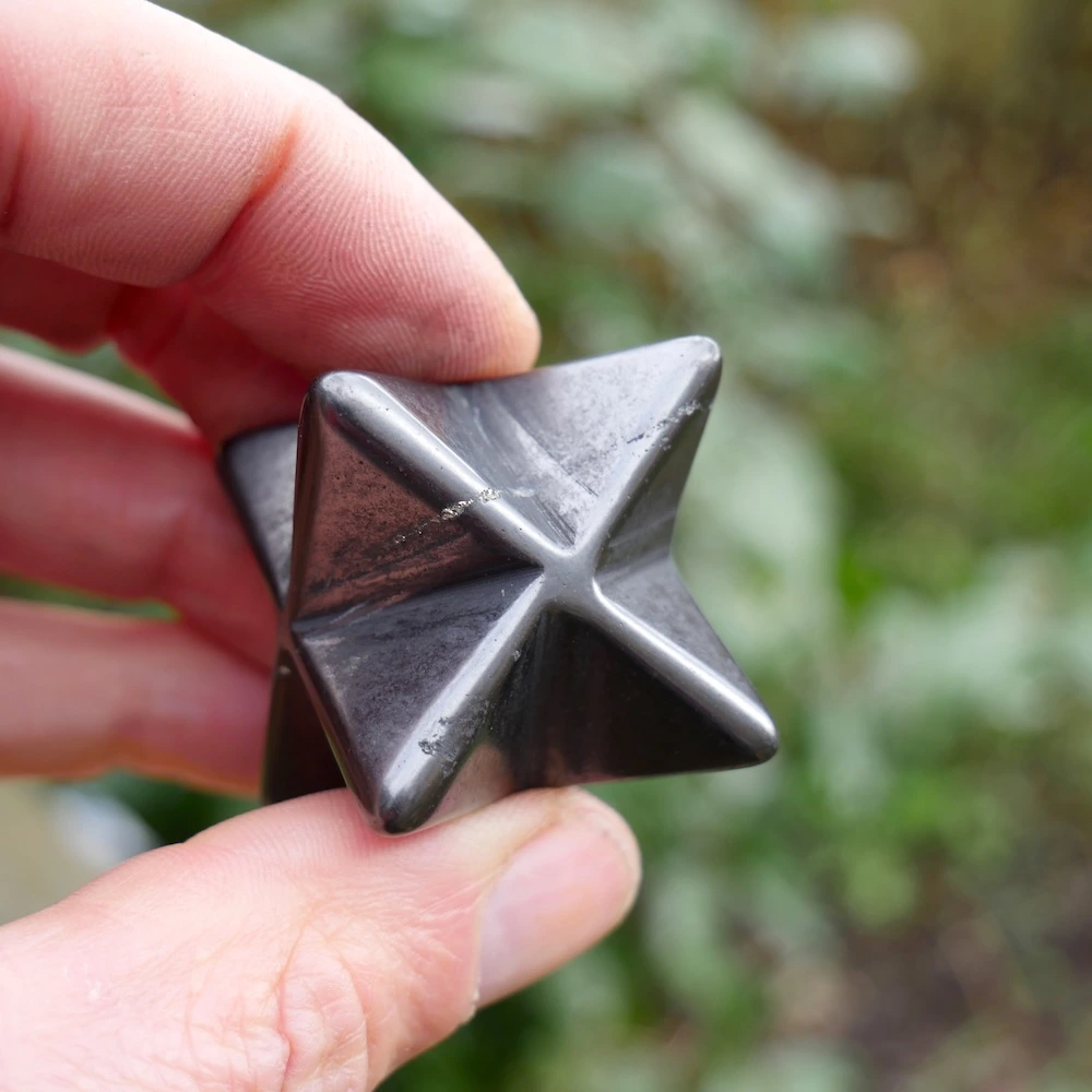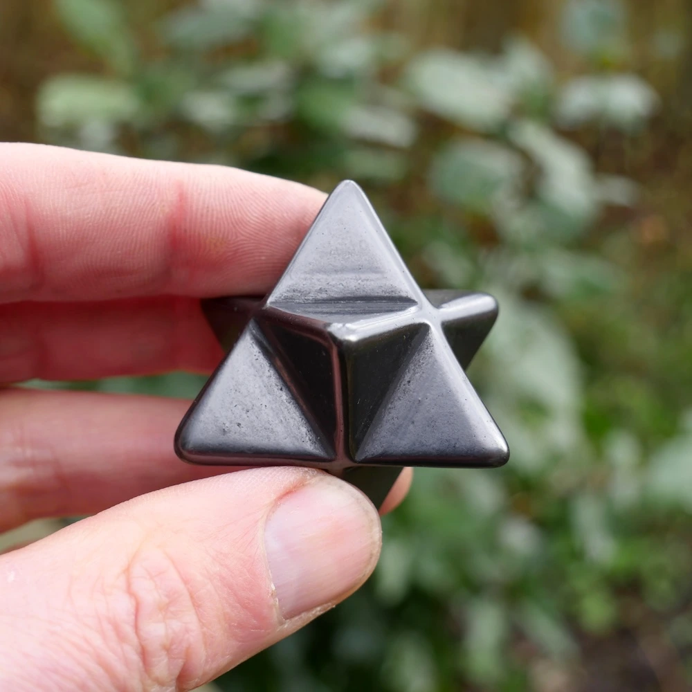 Glanzend zwarte shungiet in de vorm van een merkabah van ruim 3cm breed, de meeste zijn rond 3,3cm breedte. De kwaliteit van shungiet gecombineerd met de merkabah vorm van twee in elkaar geschoven gelijkzijdige piramides is uitermate licht en helder. De merkabah vorm is een van de heilige geometrieën en staat voor je lichtlichaam, dat wat overblijft als je bent overleden. Je oneindige bron en verbinding met universele wijsheid. De shungiet bevat in wisselende mate oneffenheden in het materiaal, een teken dat dit een natuurlijke steen is.