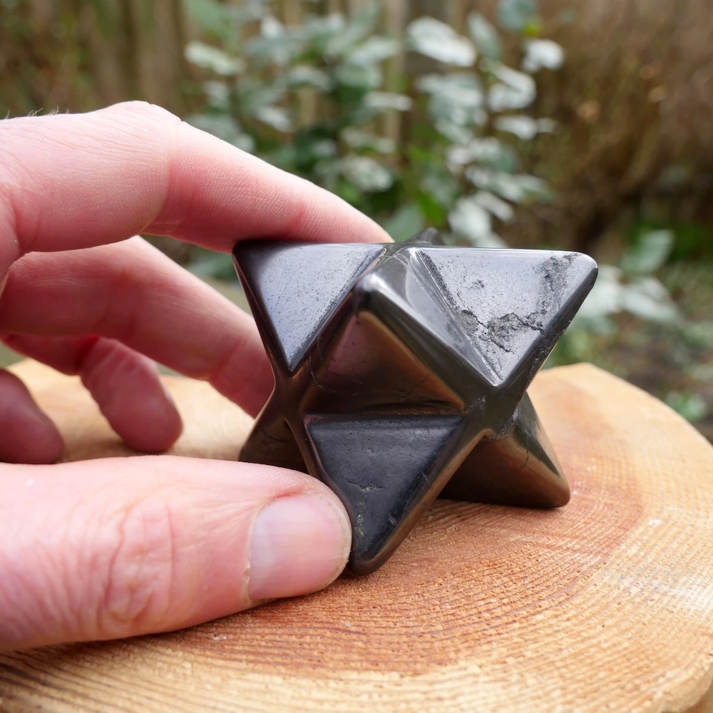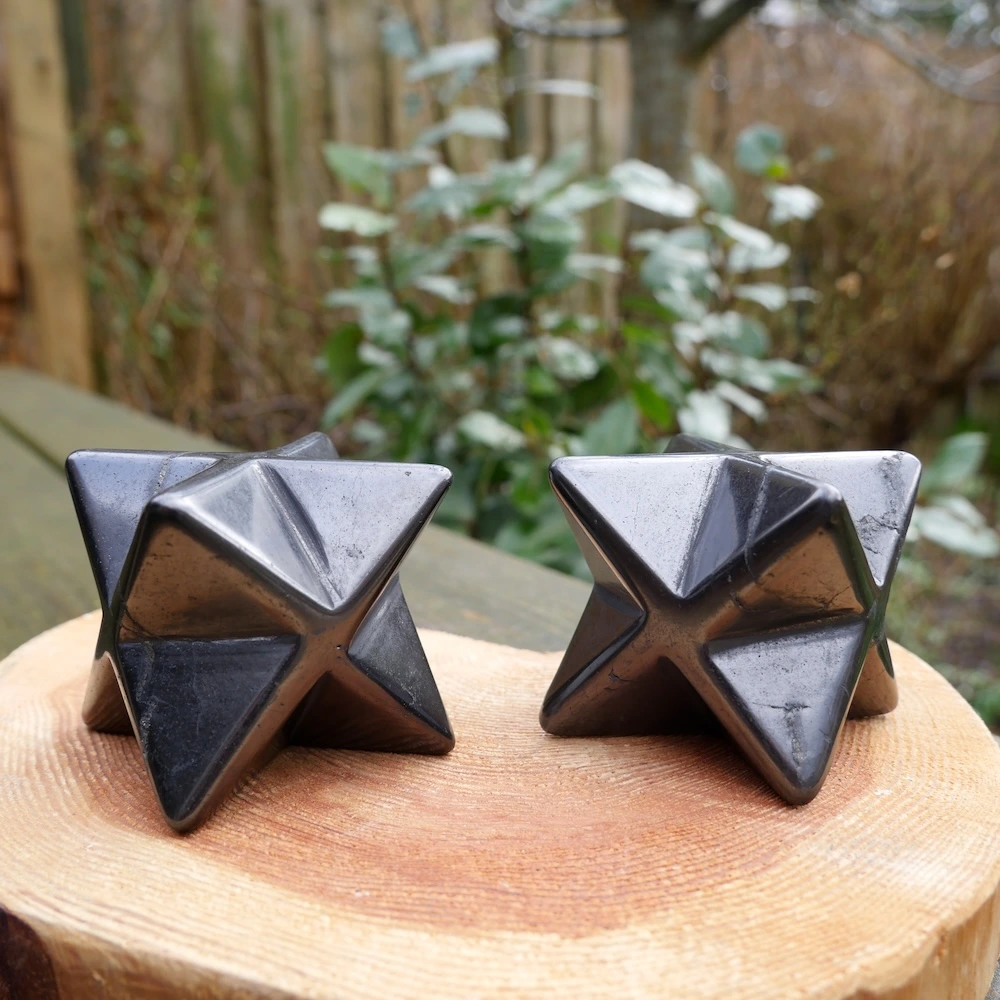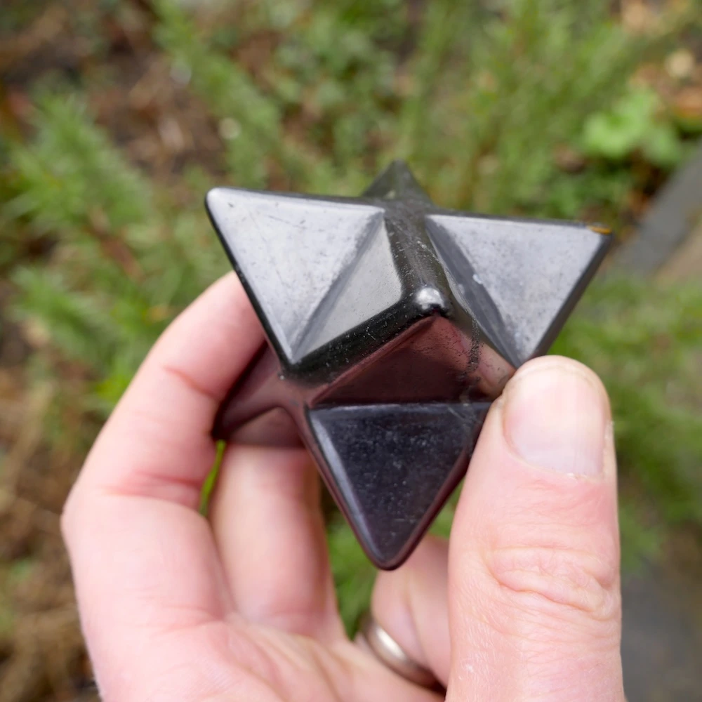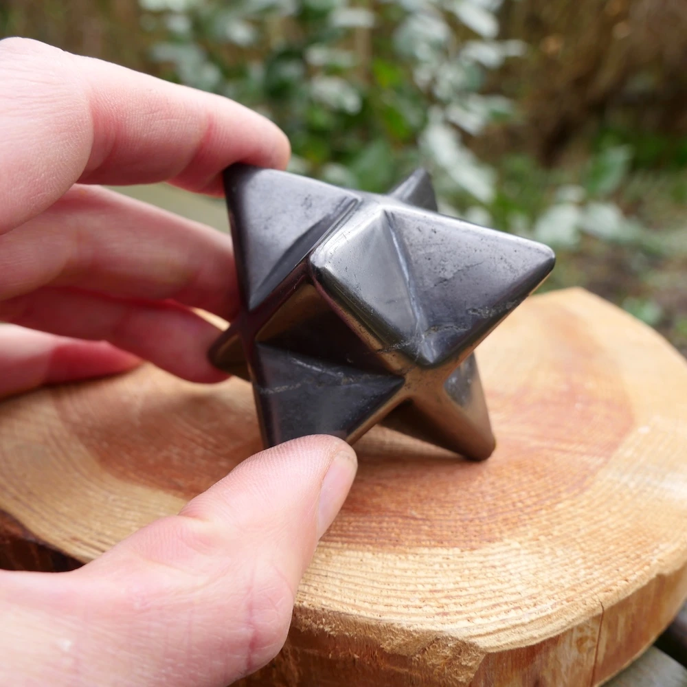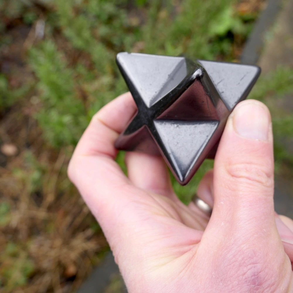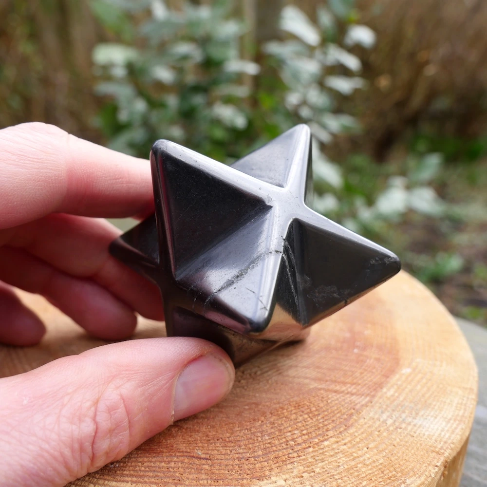 Glanzend zwarte shungiet in de vorm van een merkabah van ruim 5cm breed. De kwaliteit van shungiet gecombineerd met de merkabah vorm van twee in elkaar geschoven gelijkzijdige piramides is uitermate licht en helder. De merkabah vorm is een van de heilige geometrieën en staat voor je lichtlichaam, dat wat overblijft als je bent overleden. Je oneindige bron en verbinding met universele wijsheid. De shungiet bevat in wisselende mate oneffenheden in het materiaal, een teken dat dit een natuurlijke steen is.