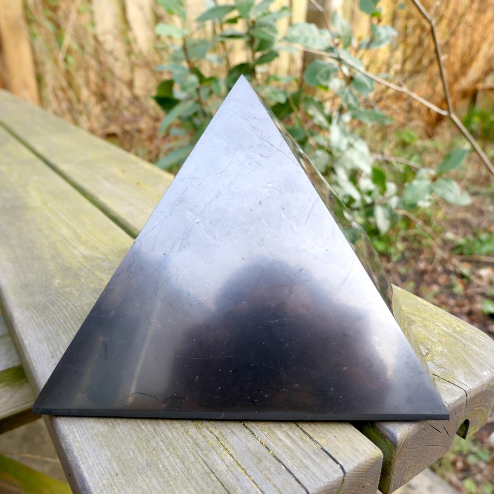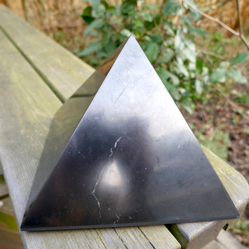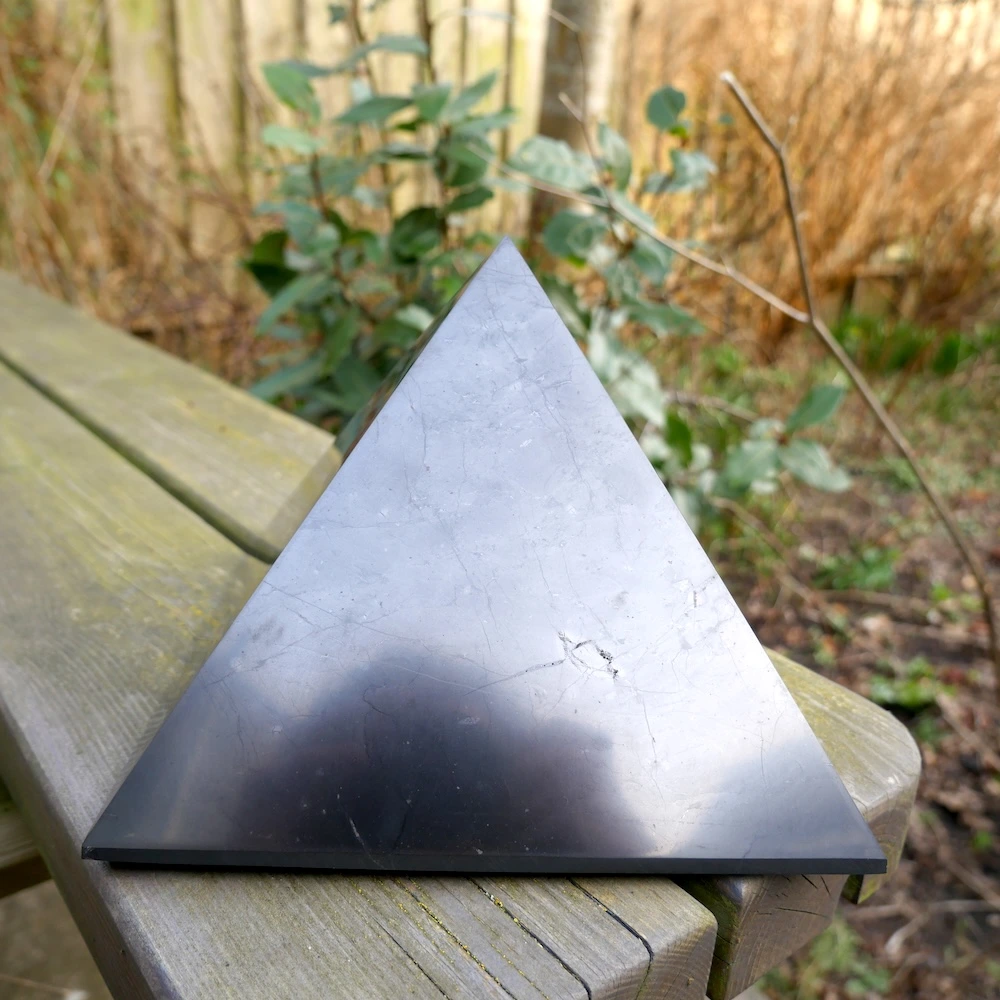 Glanzend zwarte shungiet piramide met een breedte van ongeveer 20cm en hoogte van circa 15cm. Je ontvangt de shungiet piramide van de foto. De kwaliteit van shungiet gecombineerd met de kracht van de piramidevorm maakt dit grote stuk een krachtige beschermer en reiniger van iedere ruimte. De piramidevorm versterkt de energie van de steen en zet deze stevig neer in de ruimte.
