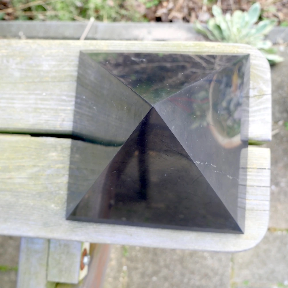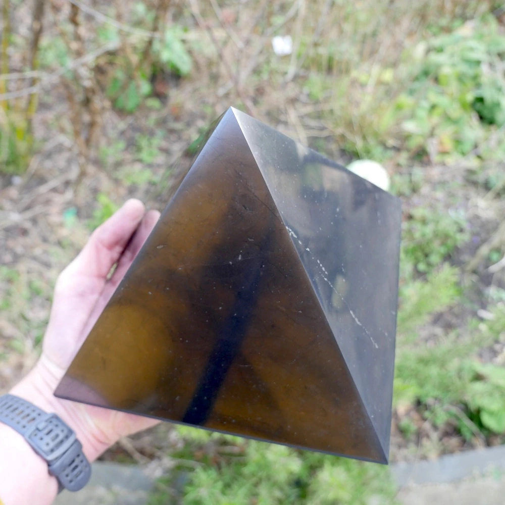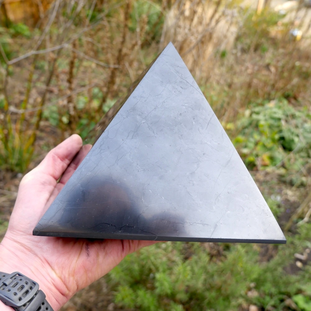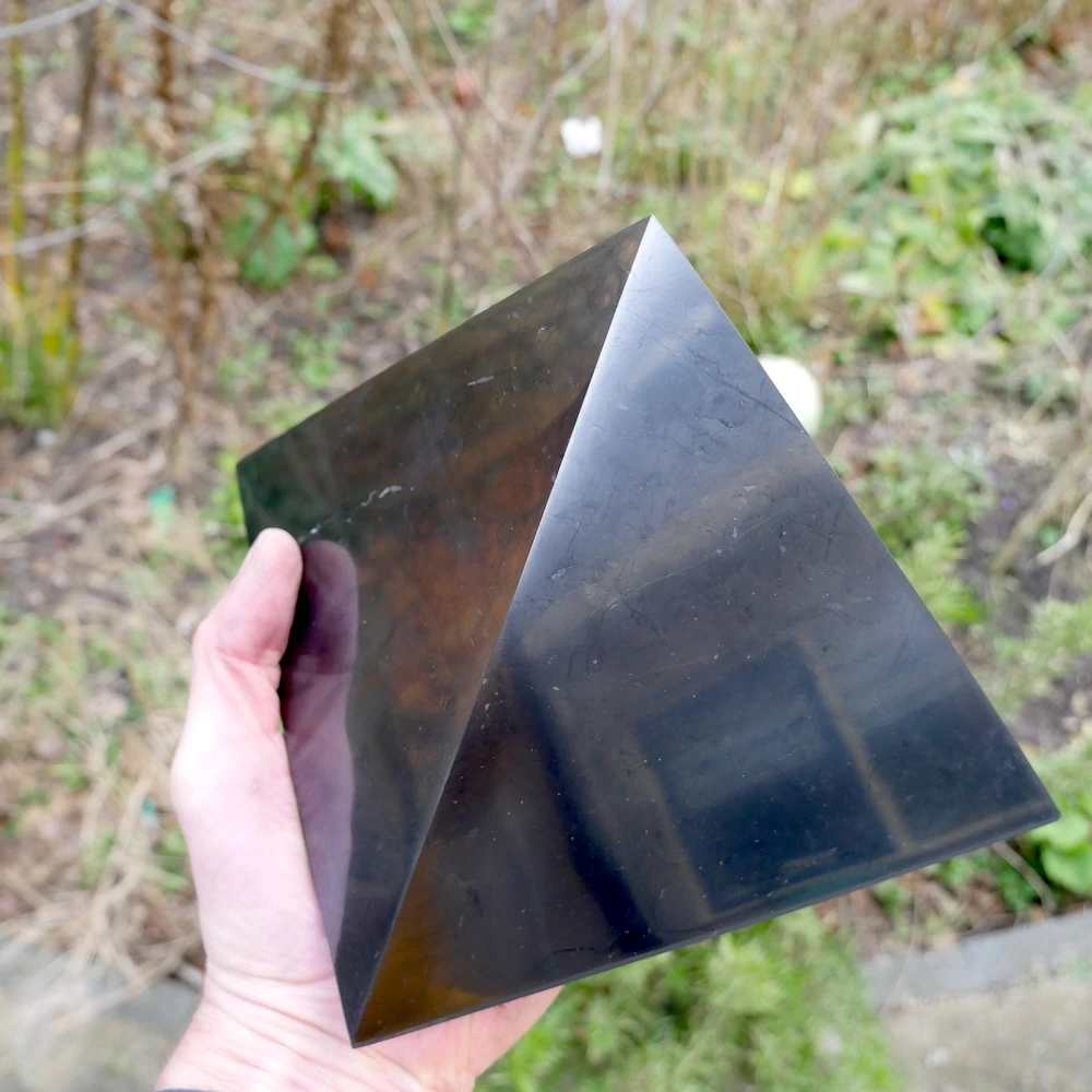 Glanzend zwarte shungiet piramide met een breedte van ongeveer 20cm en hoogte van circa 15cm. Je ontvangt de shungiet piramide van de foto. De kwaliteit van shungiet gecombineerd met de kracht van de piramidevorm maakt dit grote stuk een krachtige beschermer en reiniger van iedere ruimte. De piramidevorm versterkt de energie van de steen en zet deze stevig neer in de ruimte.
