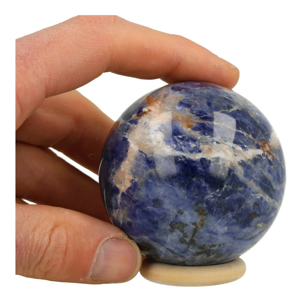 Fraai getekende sodaliet bol met de karakteristieke diep-blauwe kleur en witte calciet aders uit Kunene River, Namibië. De diameter van deze sodaliet bol is circa 67mm. Je ontvangt de sodaliet bol van de foto inclusief houten ring.