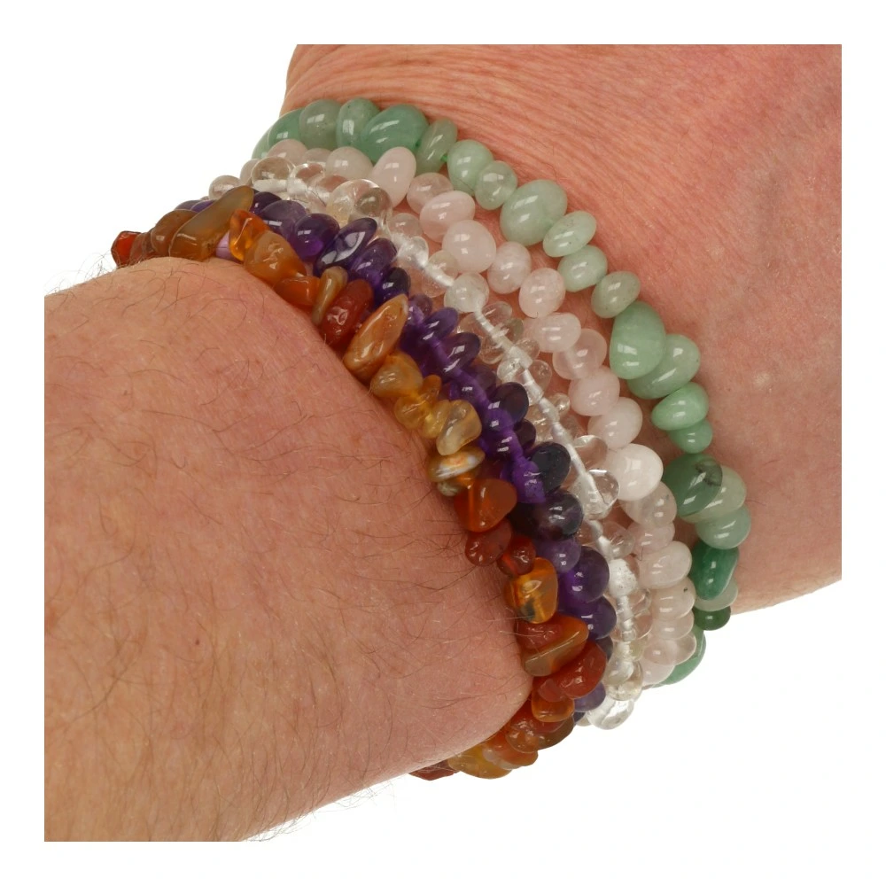 Fraaie set van 5 splitarmbanden, bestaande uit een splitarmband van groene aventurijn, carneool, amethist, rozenkwarts en bergkristal. Deze splitarmbanden zijn geregen aan rekbaar koord en bestaan uit kleine gepolijste steentjes (split). Je ontvangt een soortgelijke set als op de foto. De lengte is het beste passen bij een polsomtrek van 15-17cm.