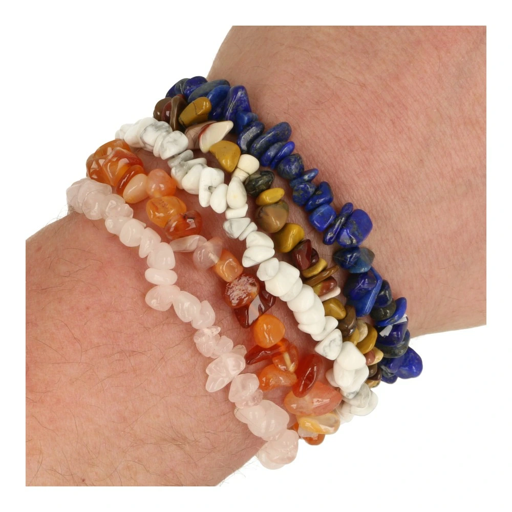 Fraaie set van 5 splitarmbanden, bestaande uit een splitarmband van carneool, howliet, lapis lazuli, mookaietjaspis en rozenkwarts. Deze splitarmbanden zijn geregen aan rekbaar koord en bestaan uit kleine gepolijste steentjes (split). Je ontvangt een soortgelijke set als op de foto. De lengte is het beste passen bij een polsomtrek van 15-17cm.