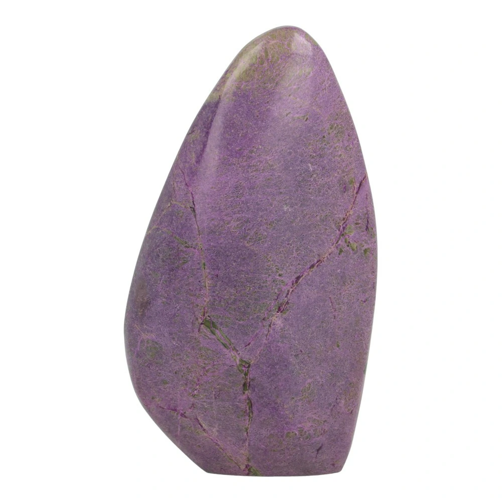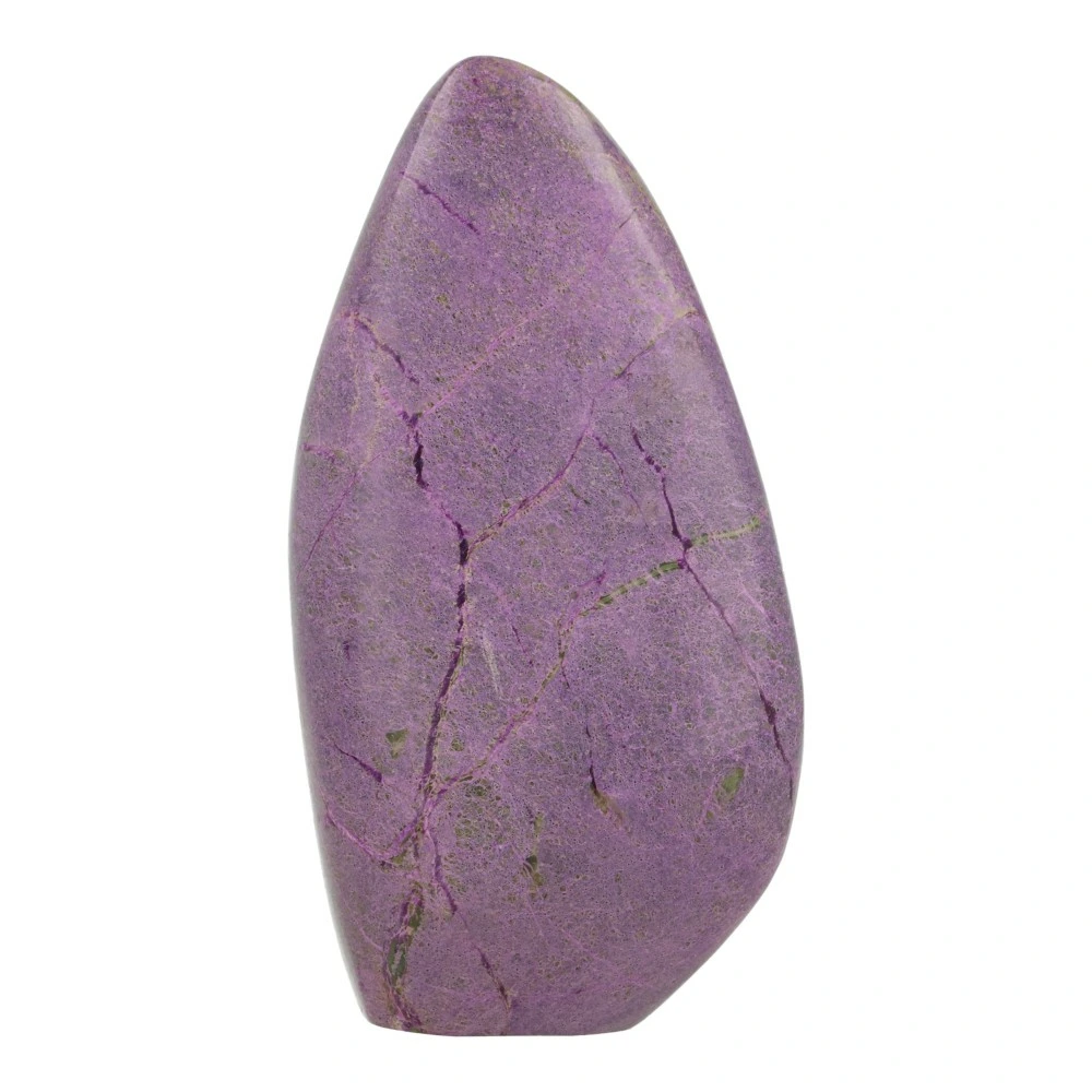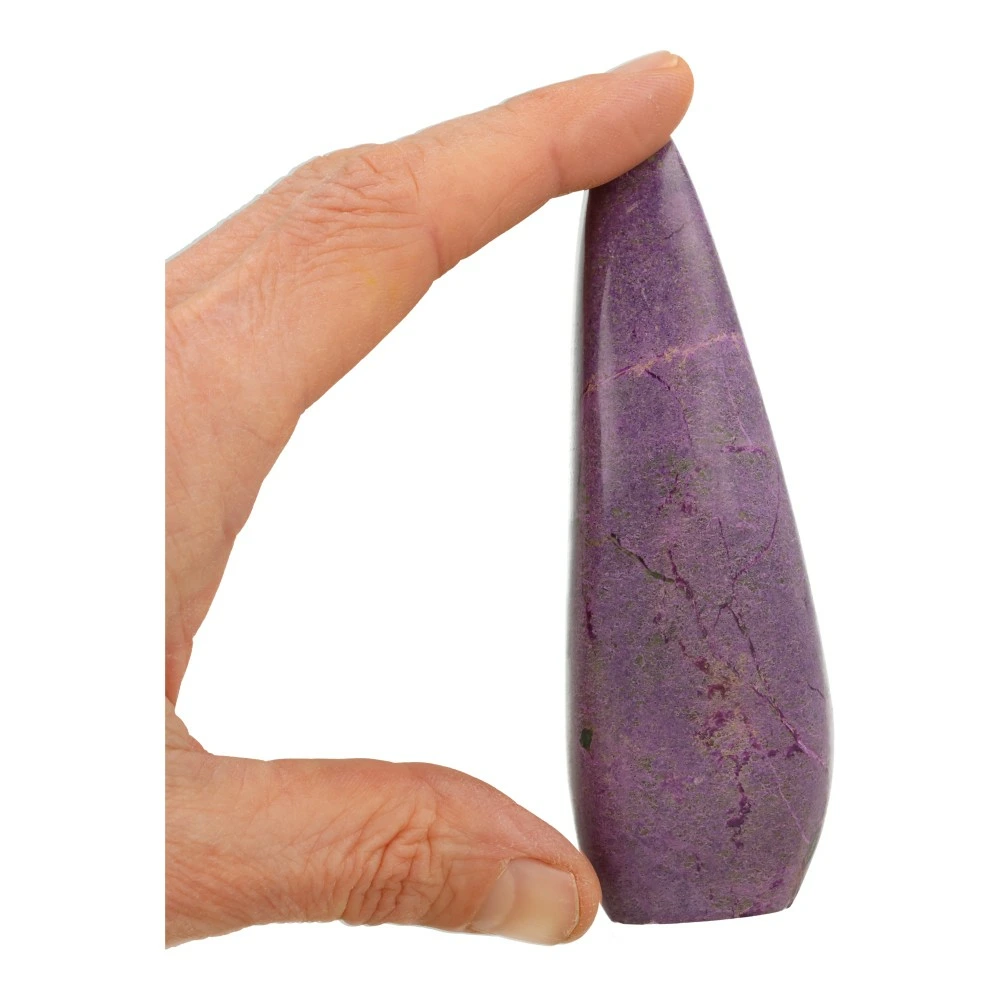 Fraaie paarse stichtiet gepolijst uit Barberton, Zuid-Afrika. Uniek stuk met fraaie kleur en vorm. Dit stuk staat fraai rechtop. De afmeting is ongeveer 108mm hoog, 59mm breed en 35mm diep. Je ontvangt het stuk paarse stichtiet van de foto.