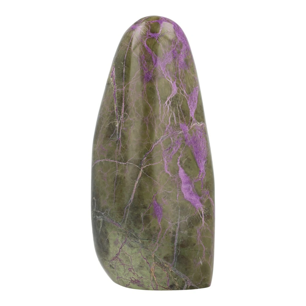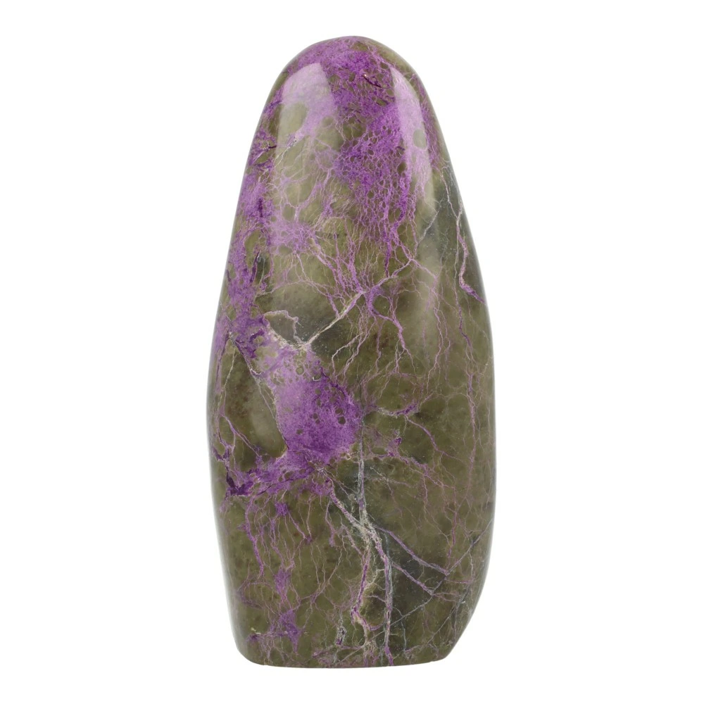 Fraaie paarse stichtiet met serpentijn gepolijst groot uit Barberton, Zuid-Afrika. Uniek stuk met fraaie kleur en vorm. Dit stuk staat fraai rechtop. De afmeting is ongeveer 158mm hoog, 75mm breed en 62mm diep. Je ontvangt het stuk stichtiet van de foto.