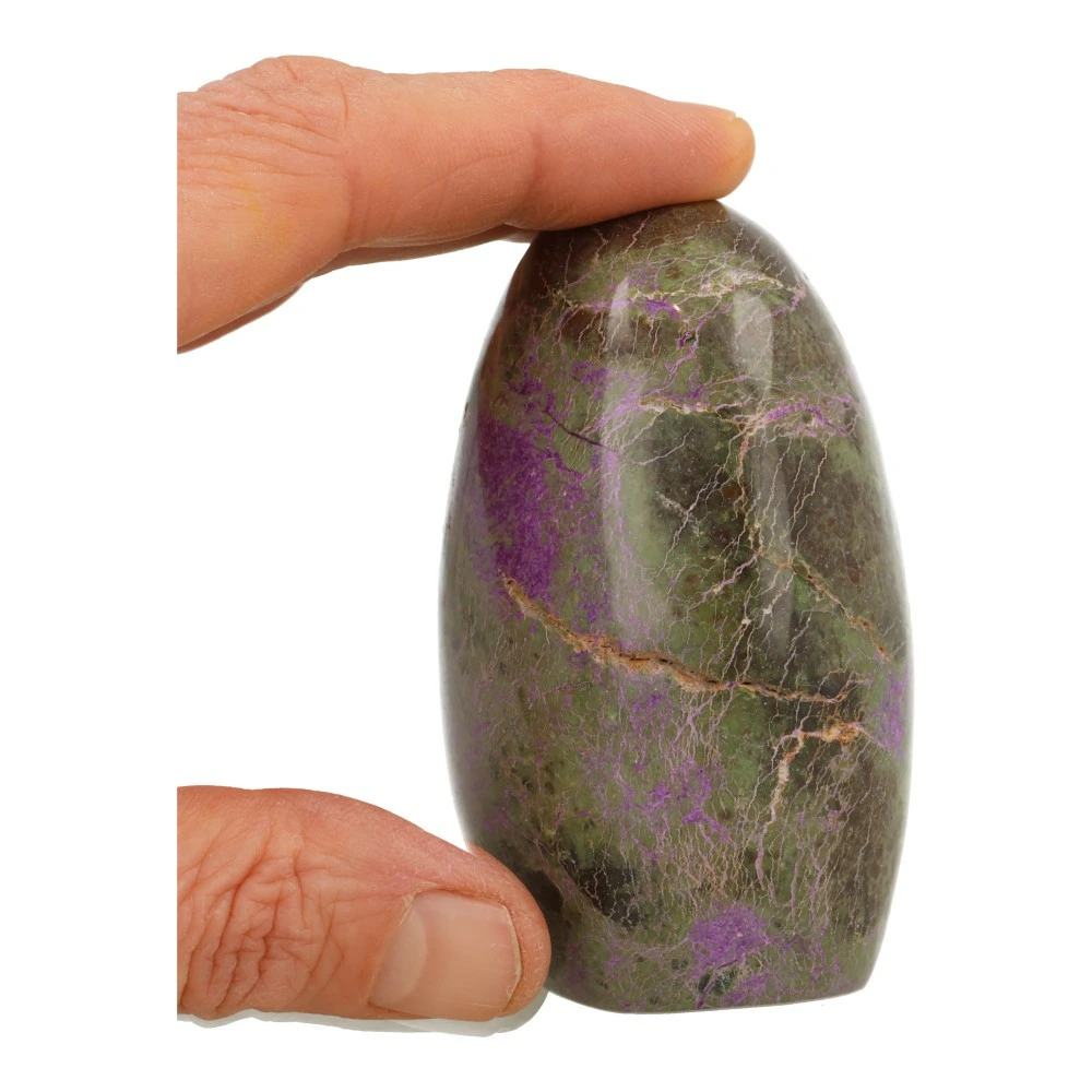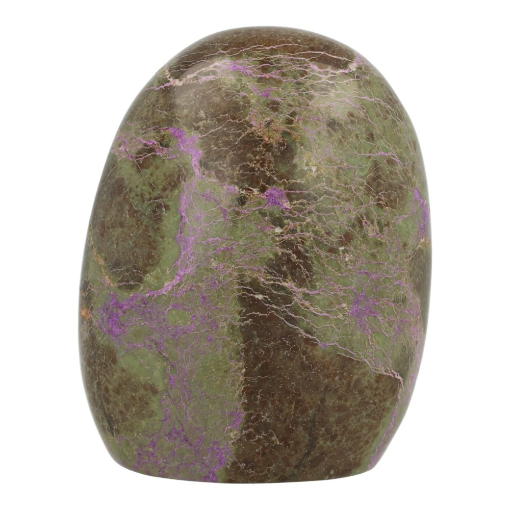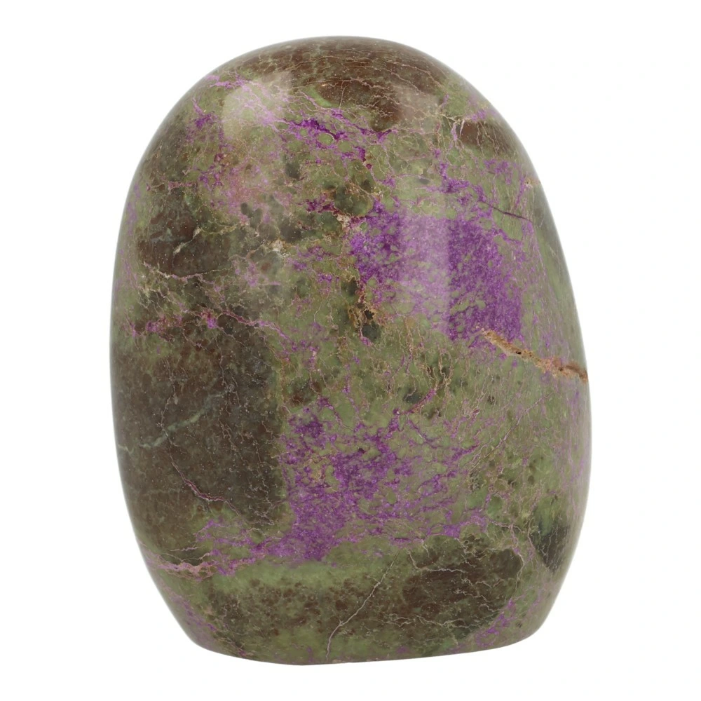 Fraaie paars met groene stichtiet gepolijst uit Barberton, Zuid-Afrika. Uniek stuk met fraaie kleur en vorm. Dit stuk staat fraai rechtop. De afmeting is ongeveer 76mm hoog, 60mm breed en 45mm diep. Je ontvangt het stuk stichtiet van de foto.