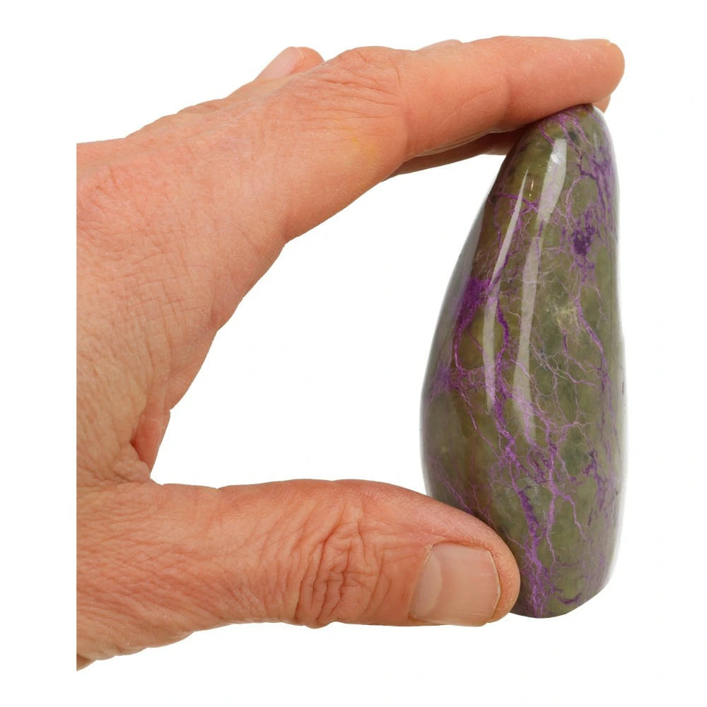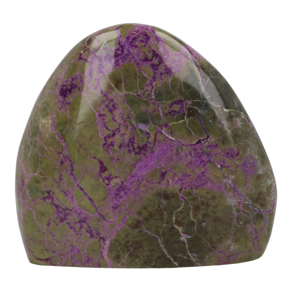 Fraaie paars met groene stichtiet gepolijst uit Barberton, Zuid-Afrika. Uniek stuk met fraaie kleur en vorm. Dit stuk staat fraai rechtop. De afmeting is ongeveer 77mm hoog, 84mm breed en 32mm diep. Je ontvangt het stuk stichtiet van de foto.