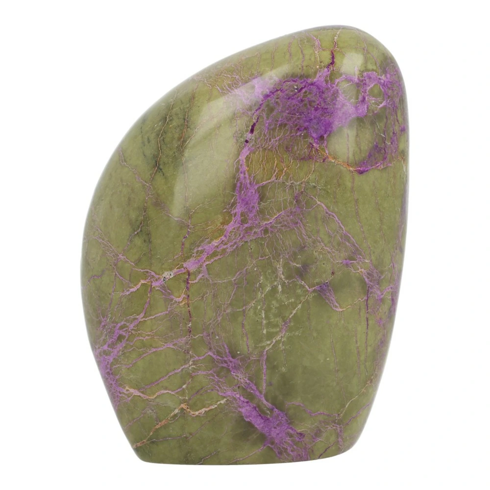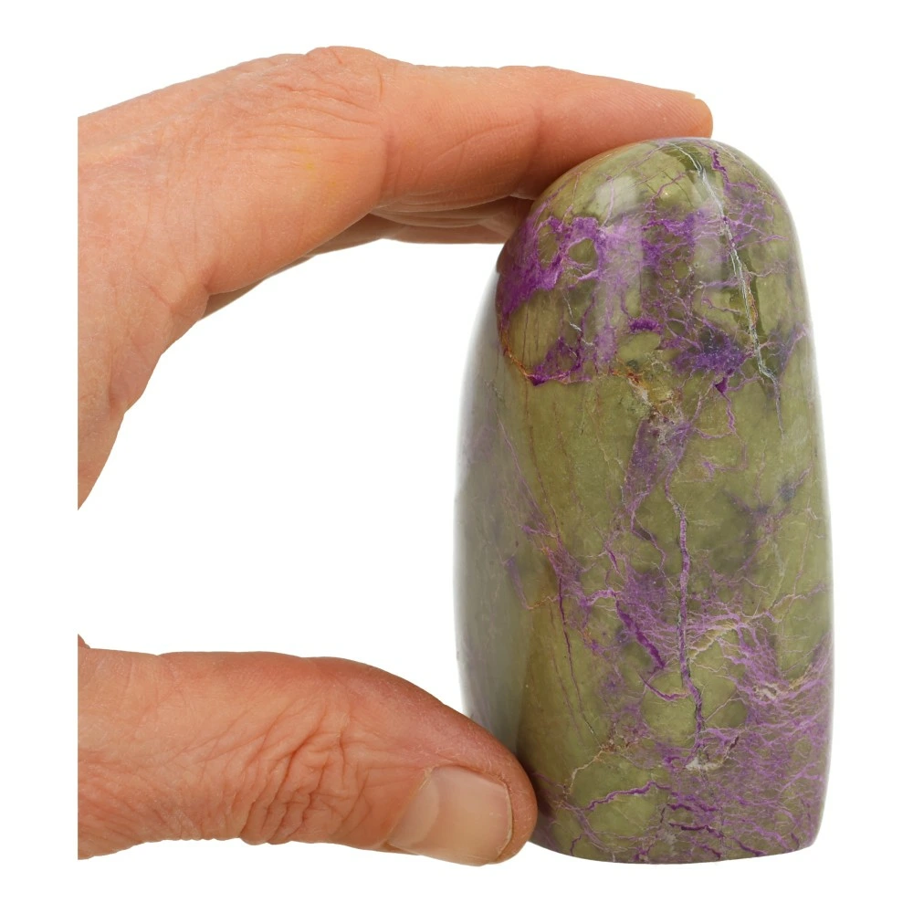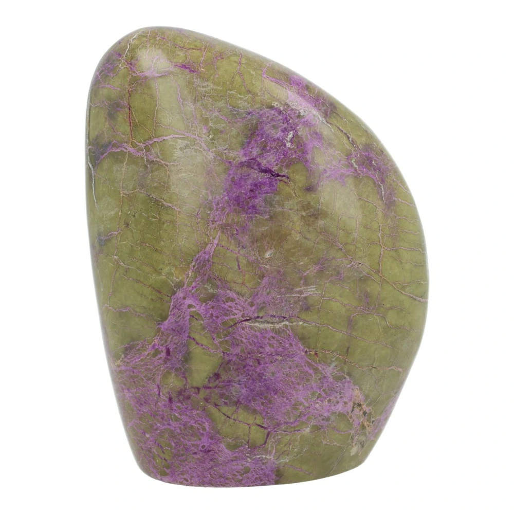 Fraaie paars met groene stichtiet gepolijst uit Barberton, Zuid-Afrika. Uniek stuk met fraaie kleur en vorm. Dit stuk staat fraai rechtop. De afmeting is ongeveer 81mm hoog, 62mm breed en 41mm diep. Je ontvangt het stuk stichtiet van de foto.