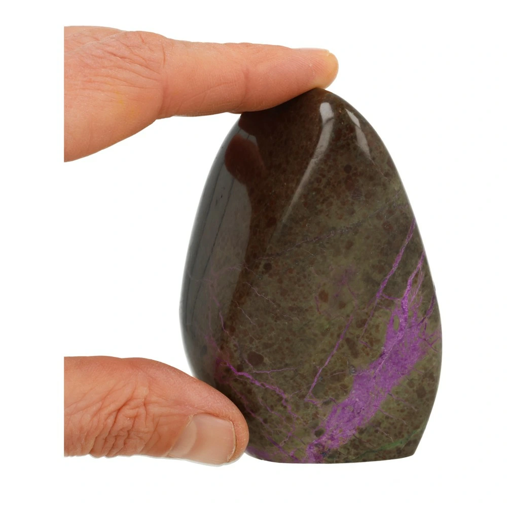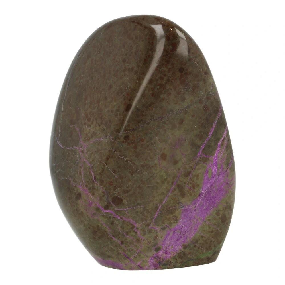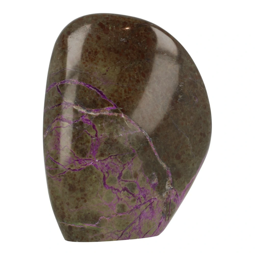 Fraaie paars met groene stichtiet gepolijst uit Barberton, Zuid-Afrika. Uniek stuk met fraaie kleur en vorm. Dit stuk staat fraai rechtop. De afmeting is ongeveer 83mm hoog, 63mm breed en 36mm diep. Je ontvangt het stuk stichtiet van de foto.