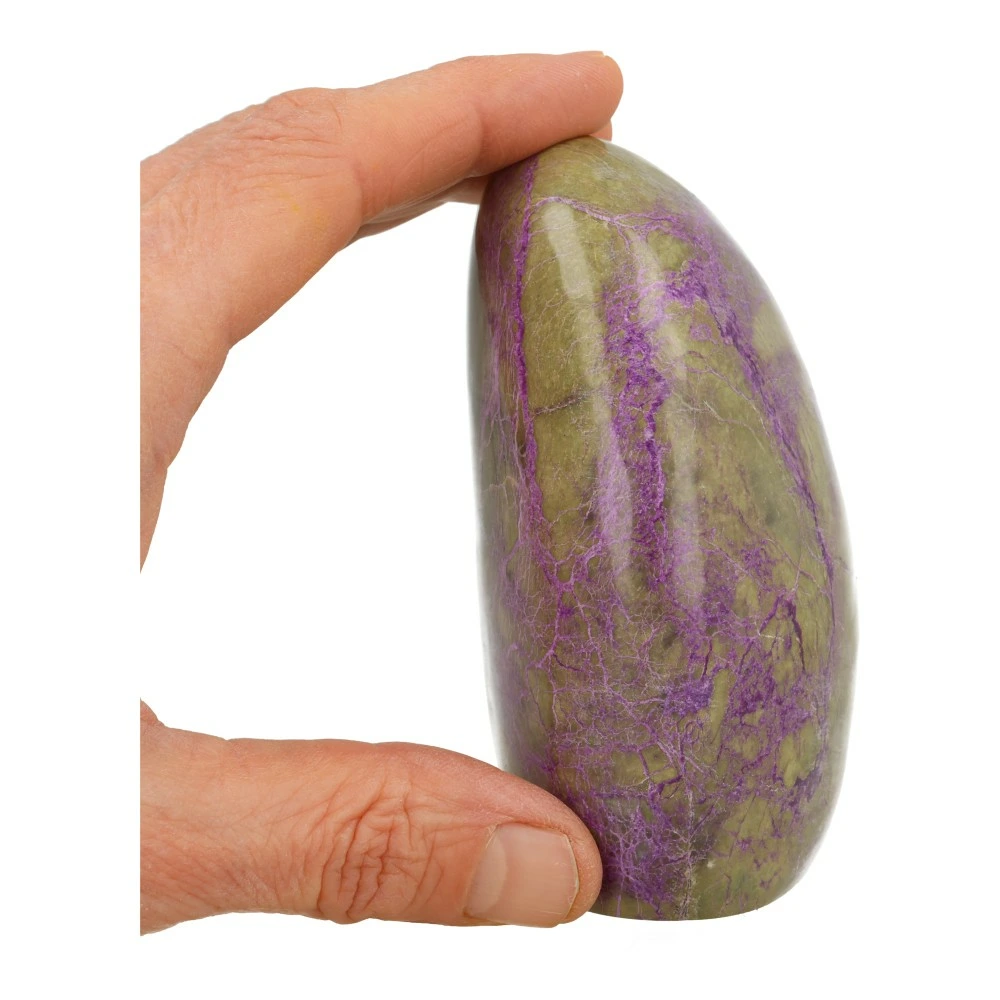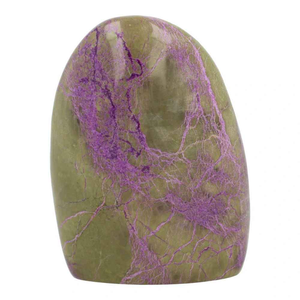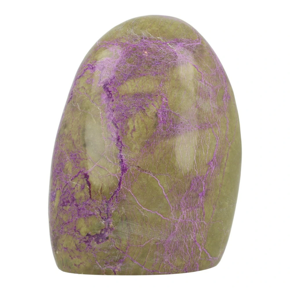 Vanwege de zachtheid van stichtiet is het stuk afgewerkt met een transparante lak. Dit helpt om de steen te beschermen en de kleuren extra mooi tot hun recht te laten komen