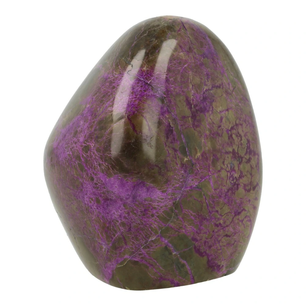 Fraaie paars met groene stichtiet gepolijst uit Barberton, Zuid-Afrika. Uniek stuk met fraaie kleur en vorm. Dit stuk stichtiet staat rechtop. De afmeting is ongeveer 85mm hoog, 74mm breed en 65mm diep. Je ontvangt de gepolijste stichtiet vrije vorm van de foto.