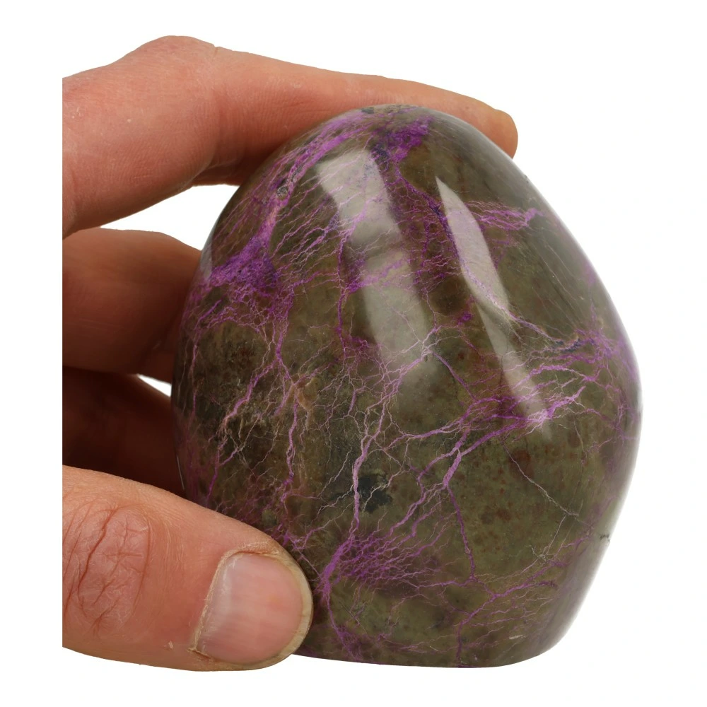 Vanwege de zachtheid van stichtiet is het stuk afgewerkt met een transparante lak. Dit helpt om de steen te beschermen en de kleuren extra mooi tot hun recht te laten komen