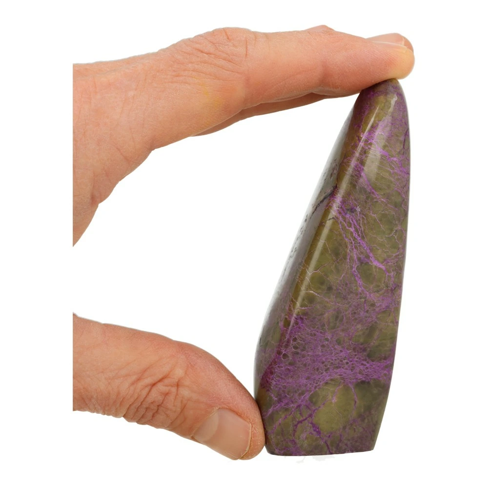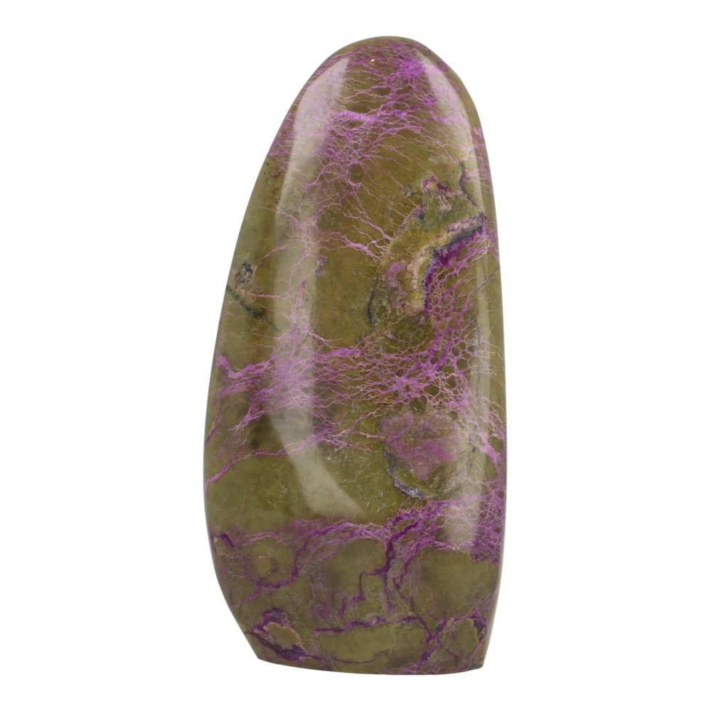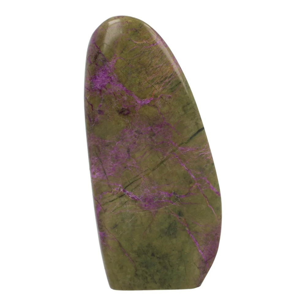 Fraaie paars met groene stichtiet gepolijst uit Barberton, Zuid-Afrika. Uniek stuk met fraaie kleur en vorm. Dit stuk stichtiet kan op mooi staan. De afmeting is ongeveer 90mm hoog, 42mm breed en 32mm diep. Je ontvangt het stuk stichtiet van de foto.