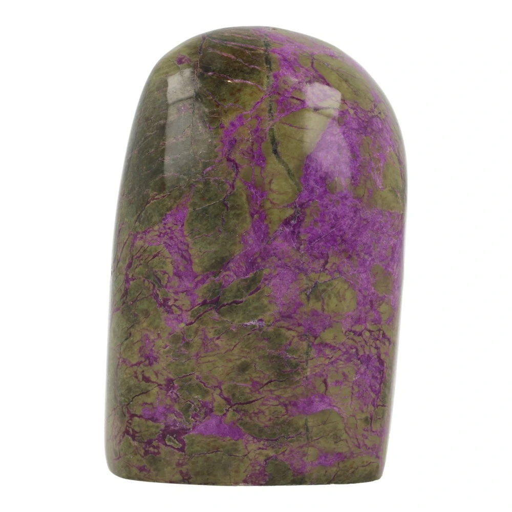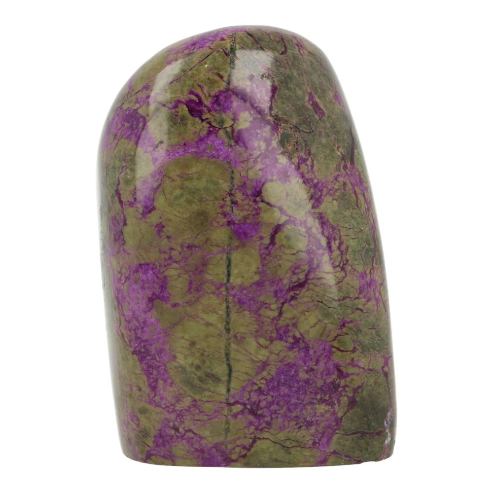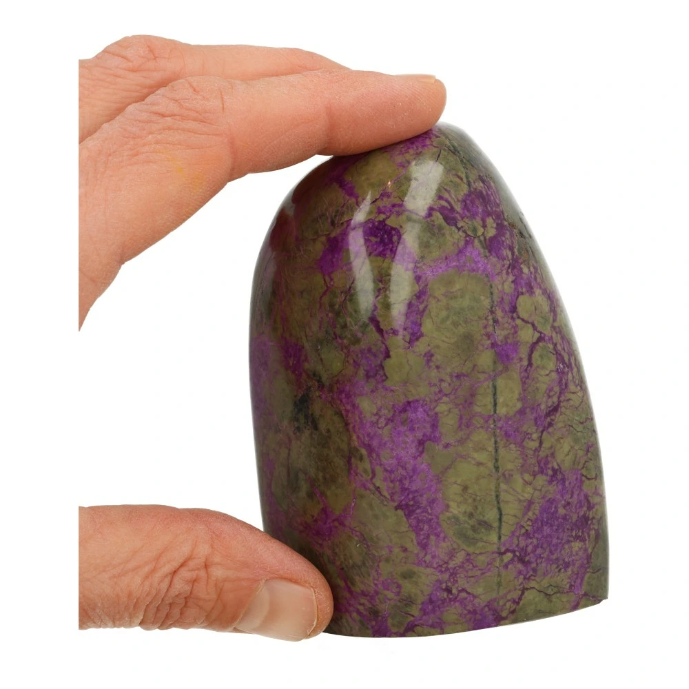 Fraaie paars met groene stichtiet vrije vorm uit Barberton, Zuid-Afrika. Uniek stuk met fraaie kleur en vorm. Dit stuk stichtiet kan staan. De afmeting is ongeveer 85mm hoog, 59mm breed en 47mm diep. Je ontvangt het stuk stichtiet van de foto.