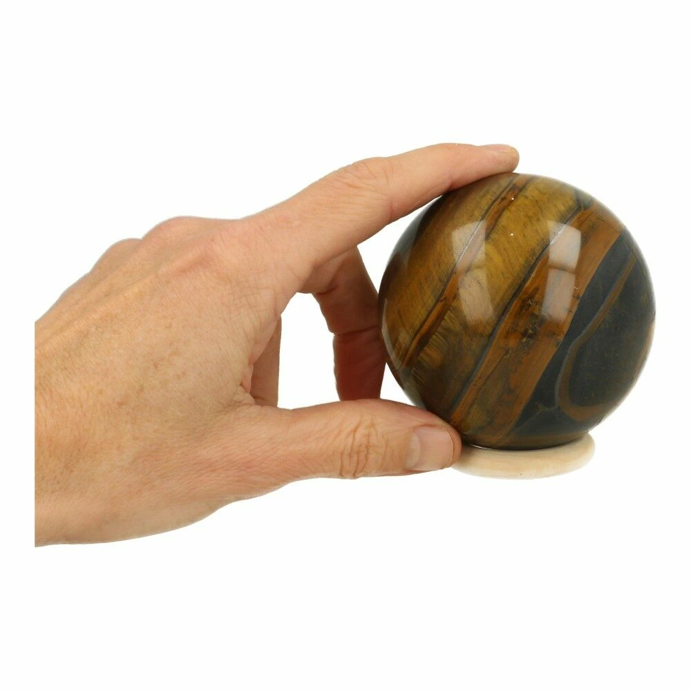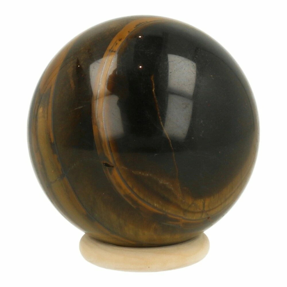 Fraaie tijgeroog bol met een diameter van circa 78mm uit Zuid-Afrika. Deze fraaie bol heeft de kenmerkende goudglans van tijgeroog. Je ontvangt deze tijgeroog bol van de foto op een houten ringetje. In het echt is de glans veel mooier dan op de foto.