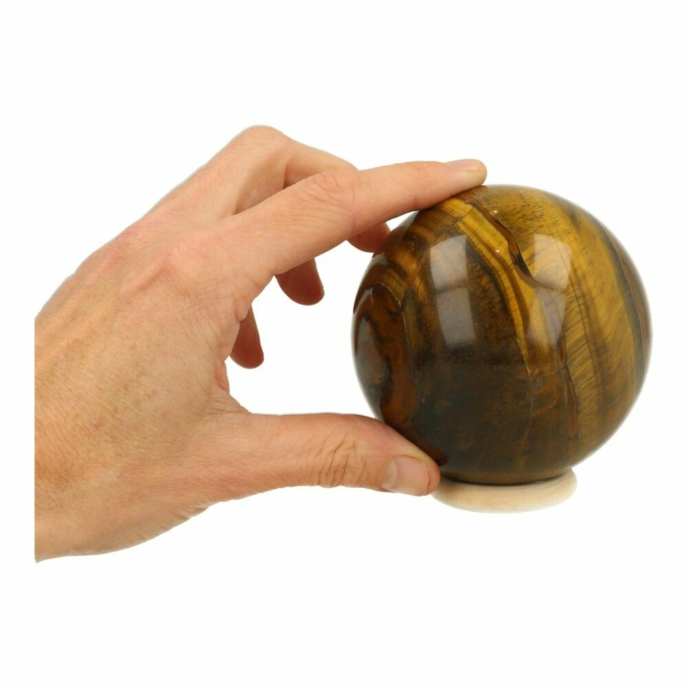 Fraaie tijgeroog bol met een diameter van circa 86mm uit Zuid-Afrika. Deze fraaie bol heeft de kenmerkende goudglans van tijgeroog. Je ontvangt deze tijgeroog bol van de foto op een houten ringetje. In het echt komt de gouden glans veel mooier naar voren en is de bol dus nog mooier.