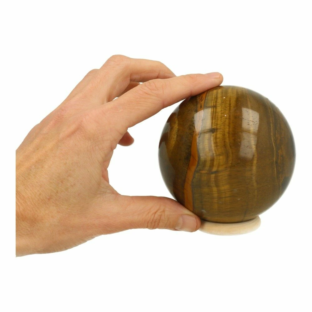 Fraaie tijgeroog bol met een diameter van circa 88mm uit Zuid-Afrika. Deze fraaie bol heeft de kenmerkende goudglans van tijgeroog. Je ontvangt deze tijgeroog bol van de foto op een houten ringetje. In het echt komt de gouden glans veel mooier naar voren en is de bol dus nog mooier.